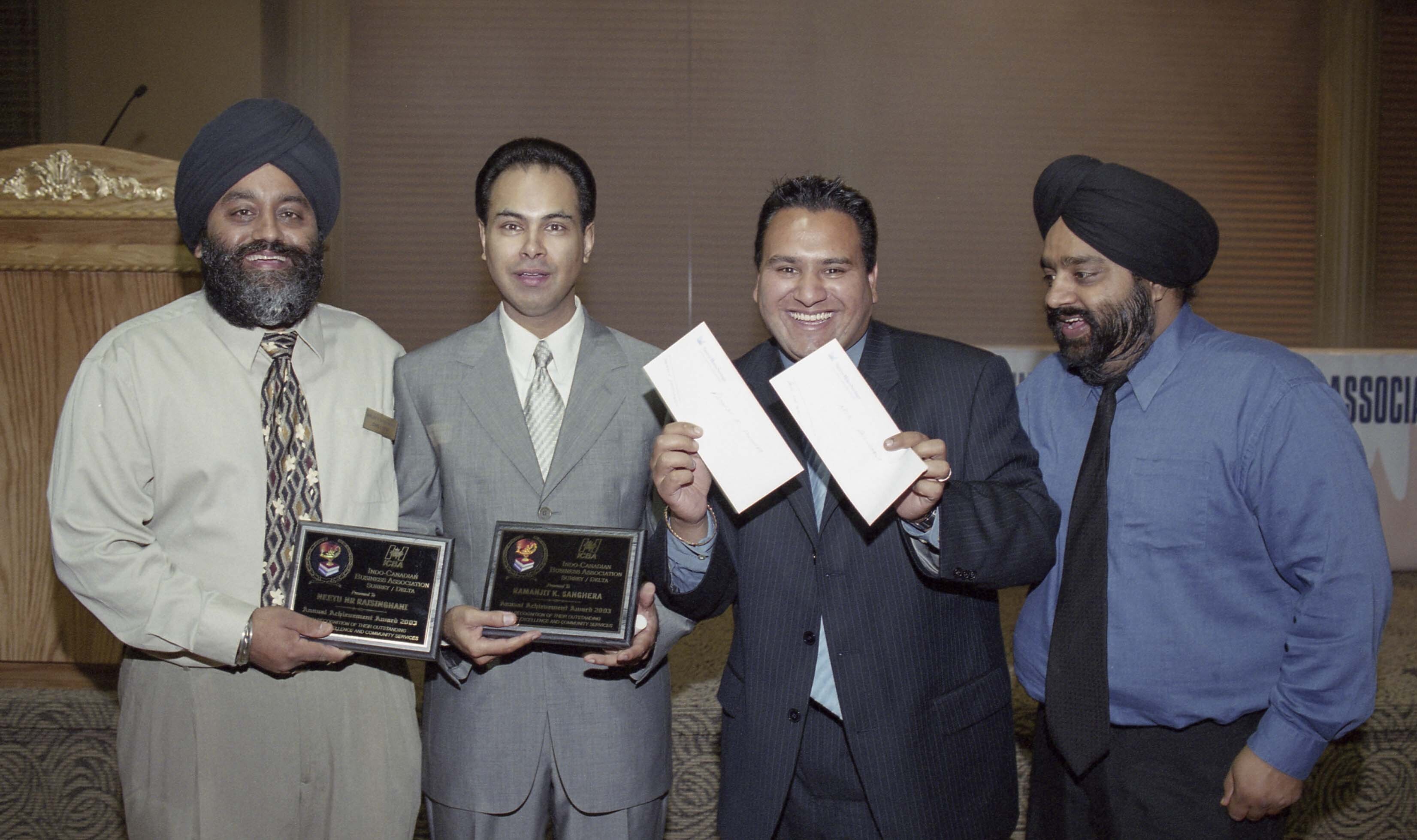 [Photograph of a group of individuals holding awards and envelopes at the Indo-Canadian Business Association Achievement Awards in Surrey]