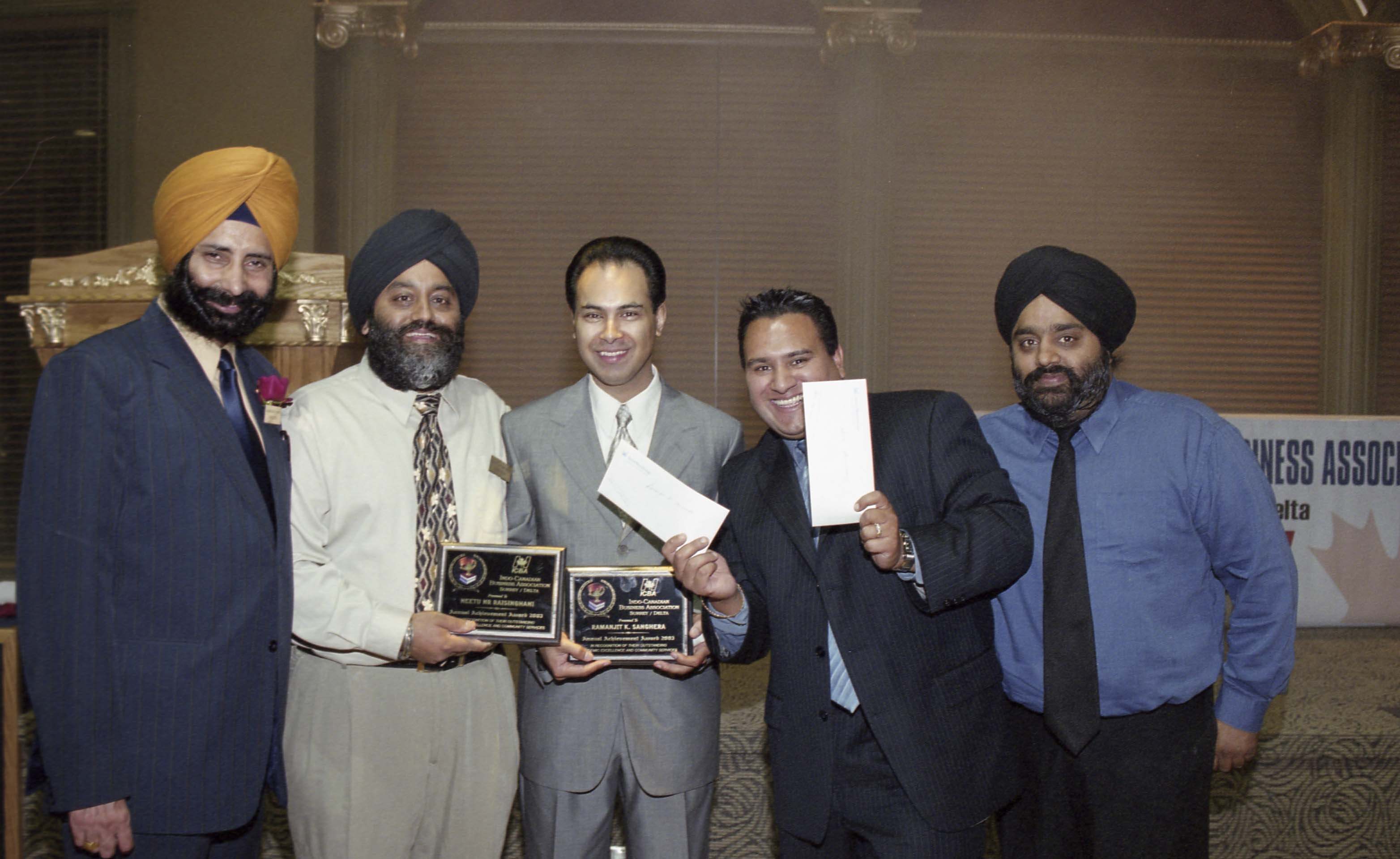 [Photograph of a group of individuals holding awards and envelopes at the Indo-Canadian Business Association Achievement Awards in Surrey]