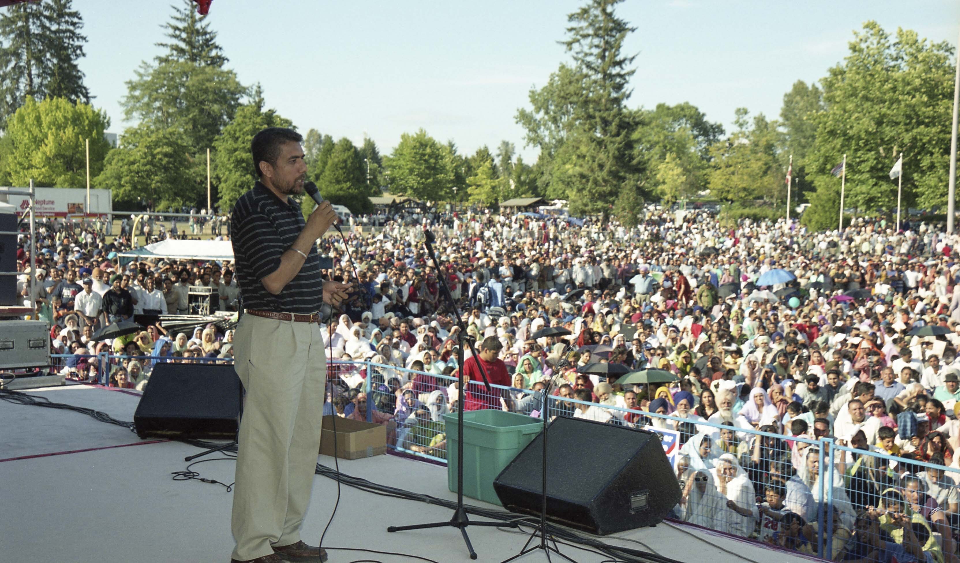 Photograph of an unidentified individual addressing the audience at the 8th annual Mela Gadri Babiyan Da. The event was organized by the Prof. Mohan Singh Memorial Foundation and took place at Bear Creek Park in Surrey, British Columbia (B.C.).