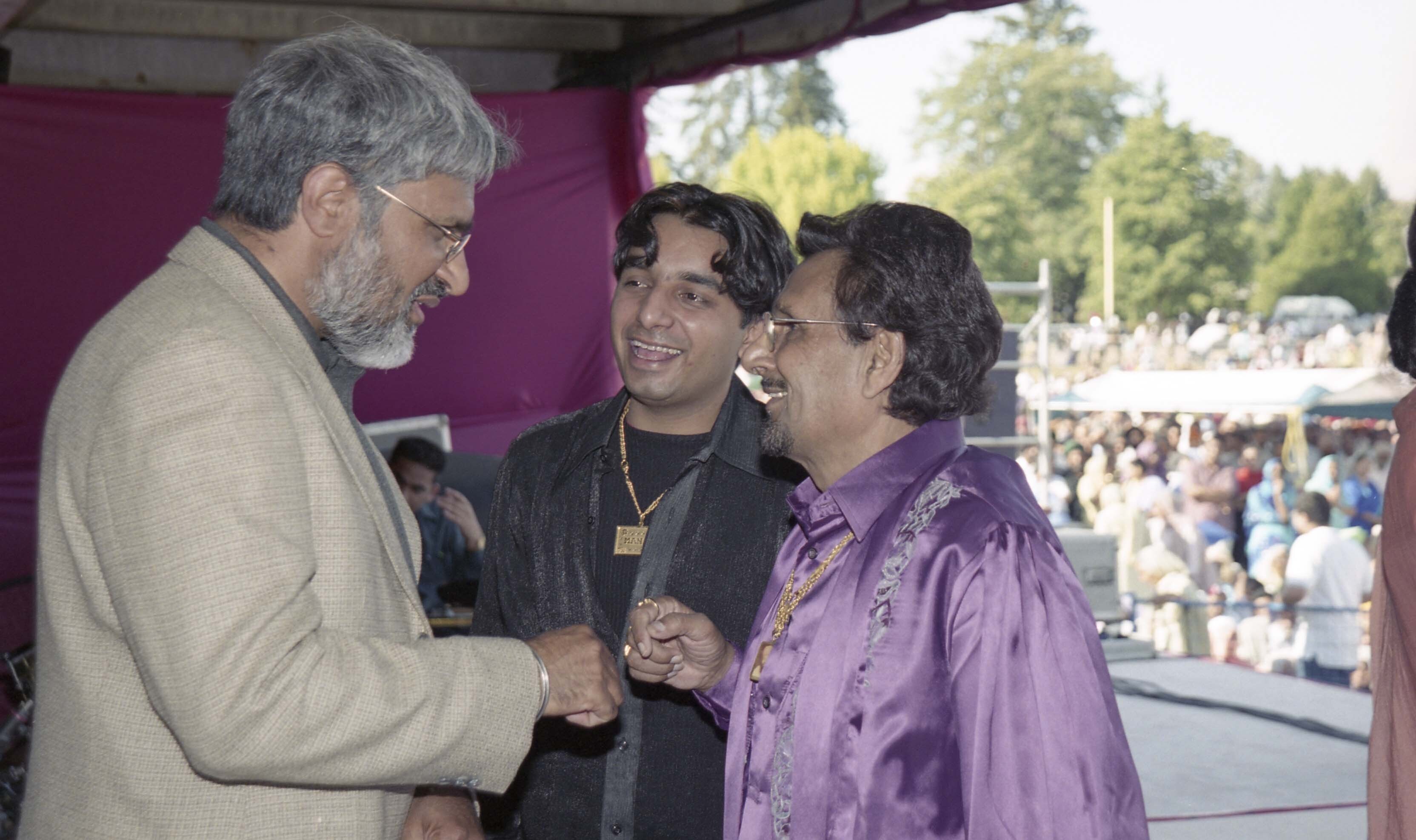 Photograph of Dr. Gulzar Cheema and Kuldeep Manak interacting at the 8th annual Mela Gadri Babiyan Da. The event was organized by the Prof. Mohan Singh Memorial Foundation and took place at Bear Creek Park in Surrey, British Columbia (B.C.).