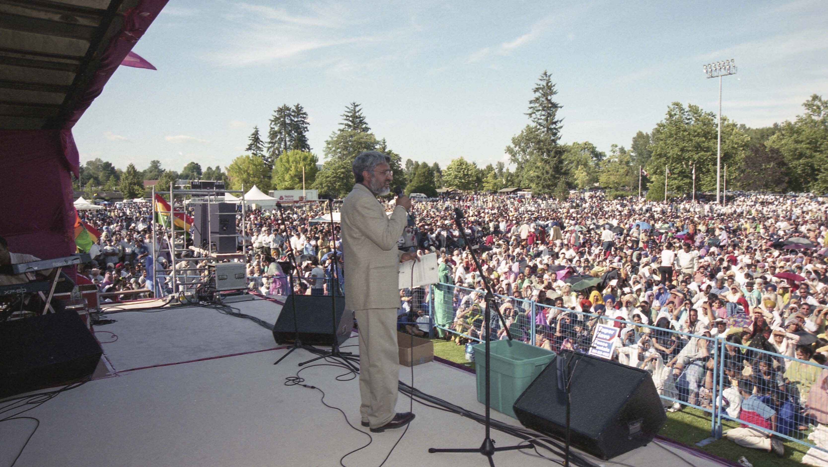 Photograph of Dr. Gulzar Cheema addressing the audience at the 8th annual Mela Gadri Babiyan Da. The event was organized by the Prof. Mohan Singh Memorial Foundation and took place at Bear Creek Park in Surrey, British Columbia (B.C.).