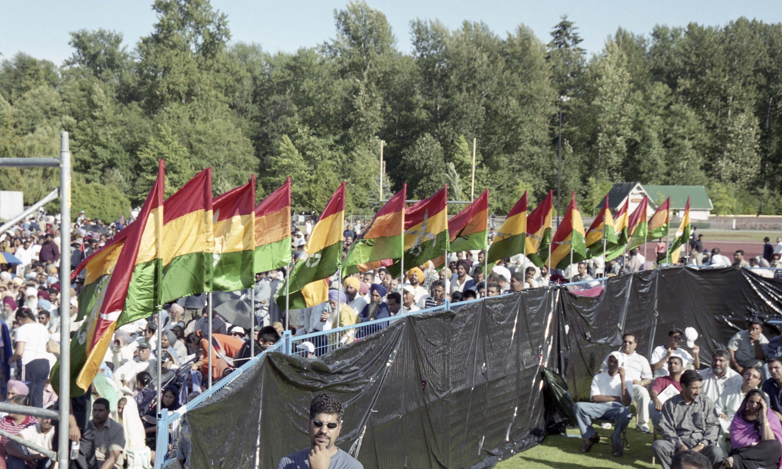 Photograph of a group of unidentified individuals at the 8th annual Mela Gadri Babiyan Da. The event was organized by the Prof. Mohan Singh Memorial Foundation and took place at Bear Creek Park in Surrey, British Columbia (B.C.).