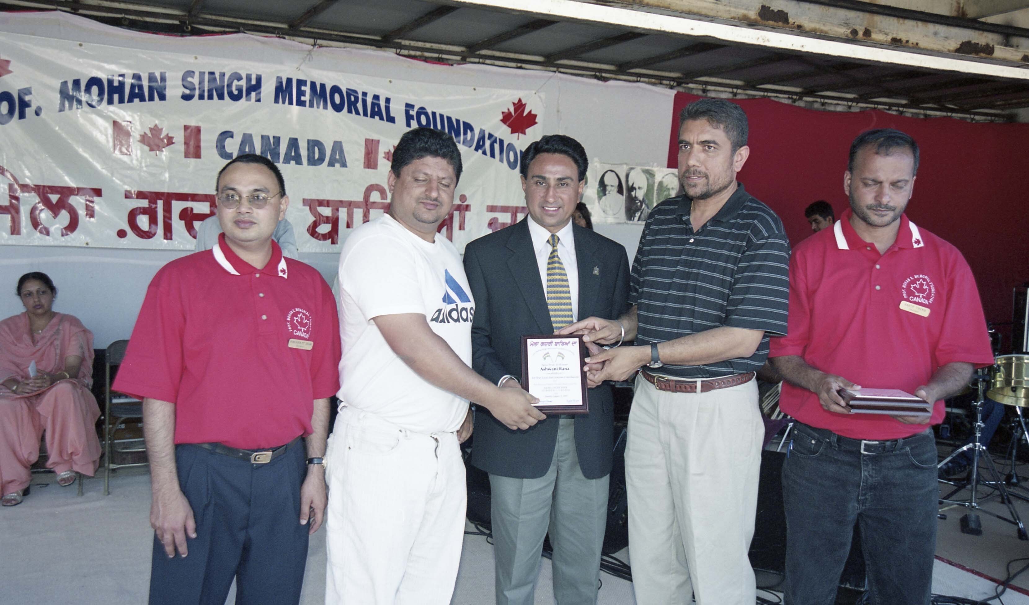 Photograph of a group of unidentified individuals, holding an award, at the 8th annual Mela Gadri Babiyan Da. The event was organized by the Prof. Mohan Singh Memorial Foundation and took place at Bear Creek Park in Surrey, British Columbia (B.C.). Among the group of individuals are Sahib Thind and Ashwani Rana[?]. An award was presented to Ashwani Rana on behalf of the Prof. Mohan Singh Memorial Foundation.