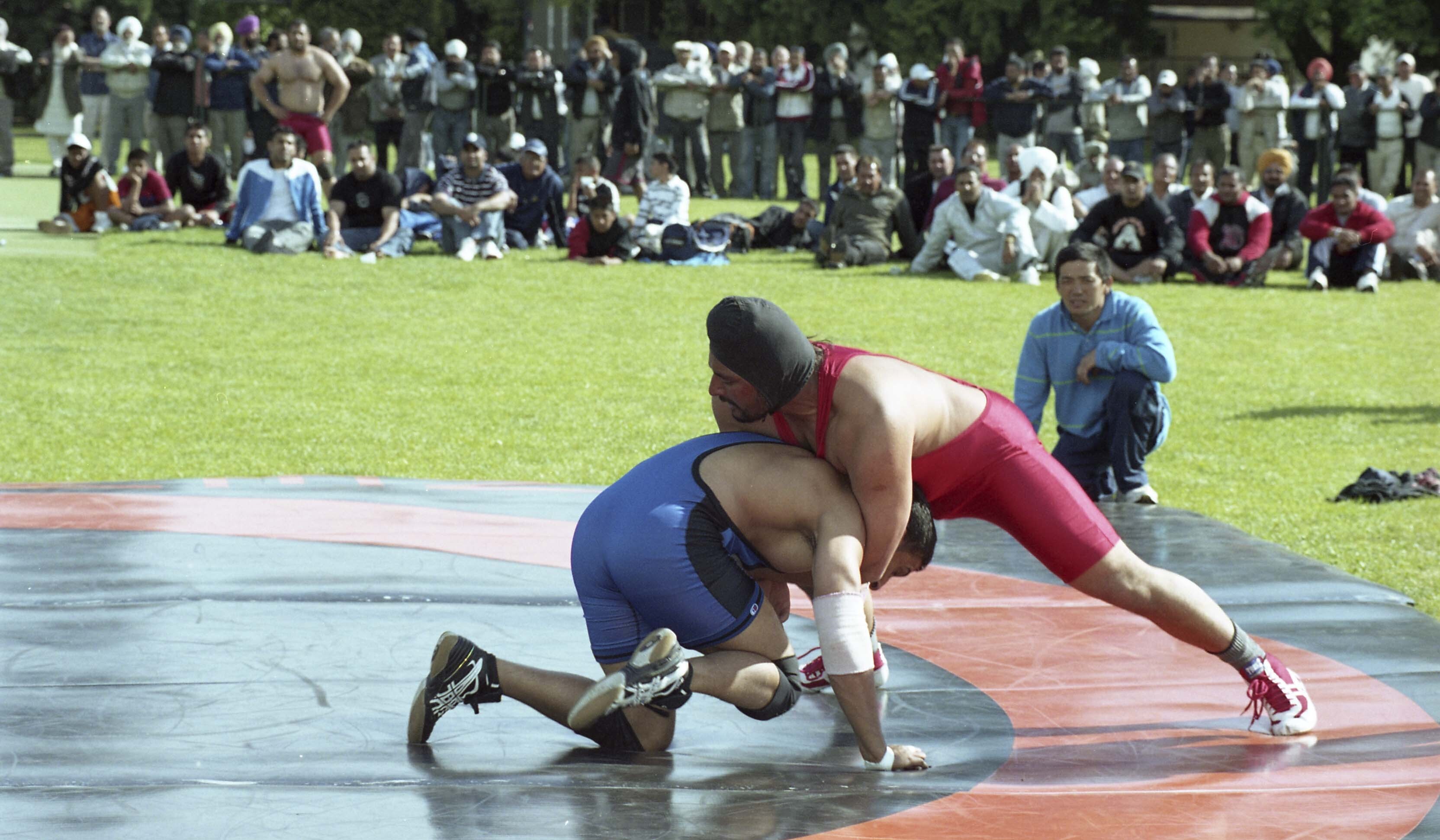 Photograph of a wrestling match (pehlwani) at the Khalsa Diwan Society's Annual Sports Day 2006, hosted at the Khalsa Diwan Society Gurdwara in Vancouver, B.C.
