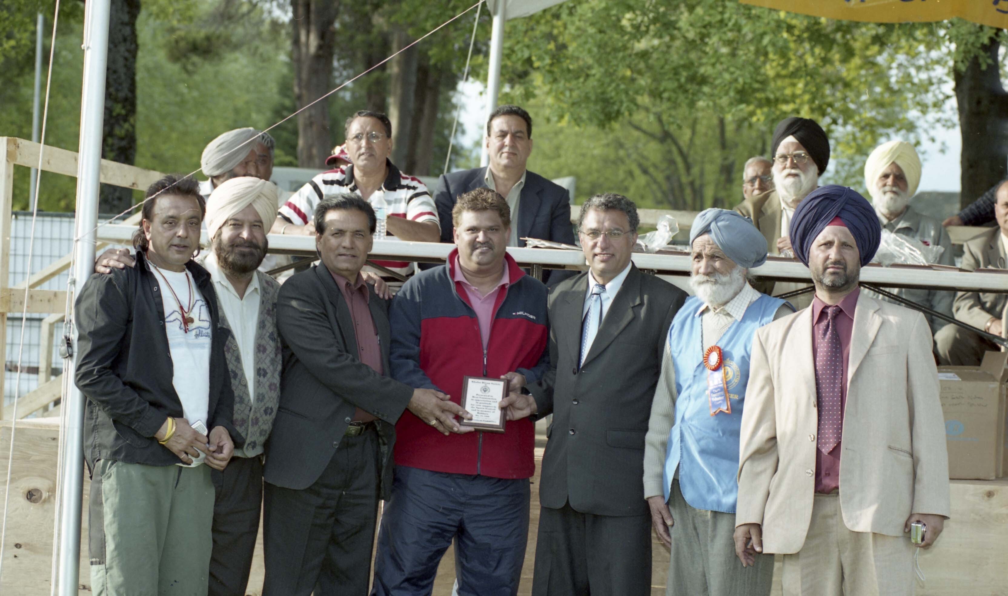 Group portrait of an unidentified man receiving a plaque at the Khalsa Diwan Society's Annual Sports Day 2006, hosted at the Khalsa Diwan Society Gurdwara in Vancouver, B.C.