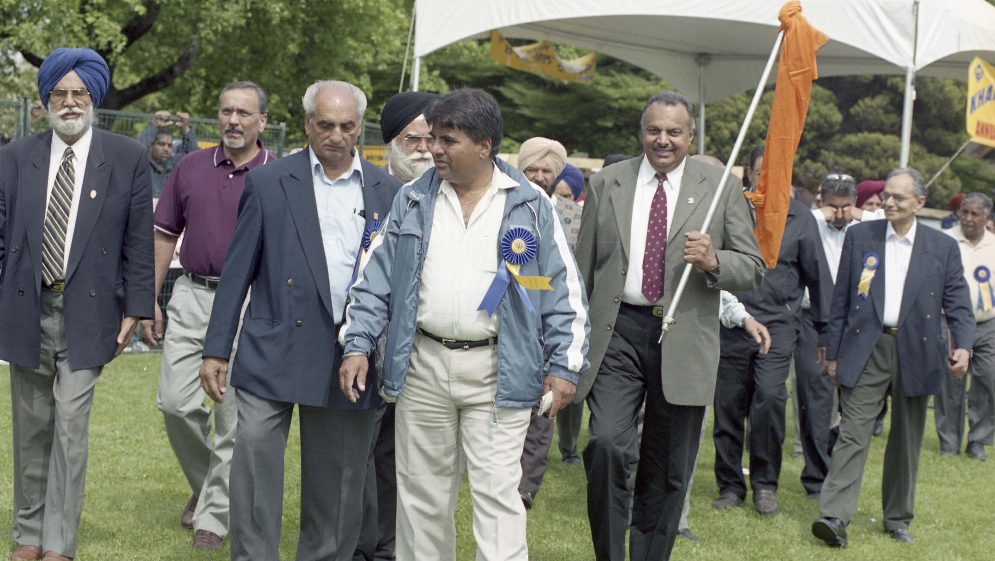 Photograph of unidentified men marching with an orange flag tied to a pole at the Khalsa Diwan Society's Annual Sports Day 2006, hosted at the Khalsa Diwan Society Gurdwara in Vancouver, B.C.