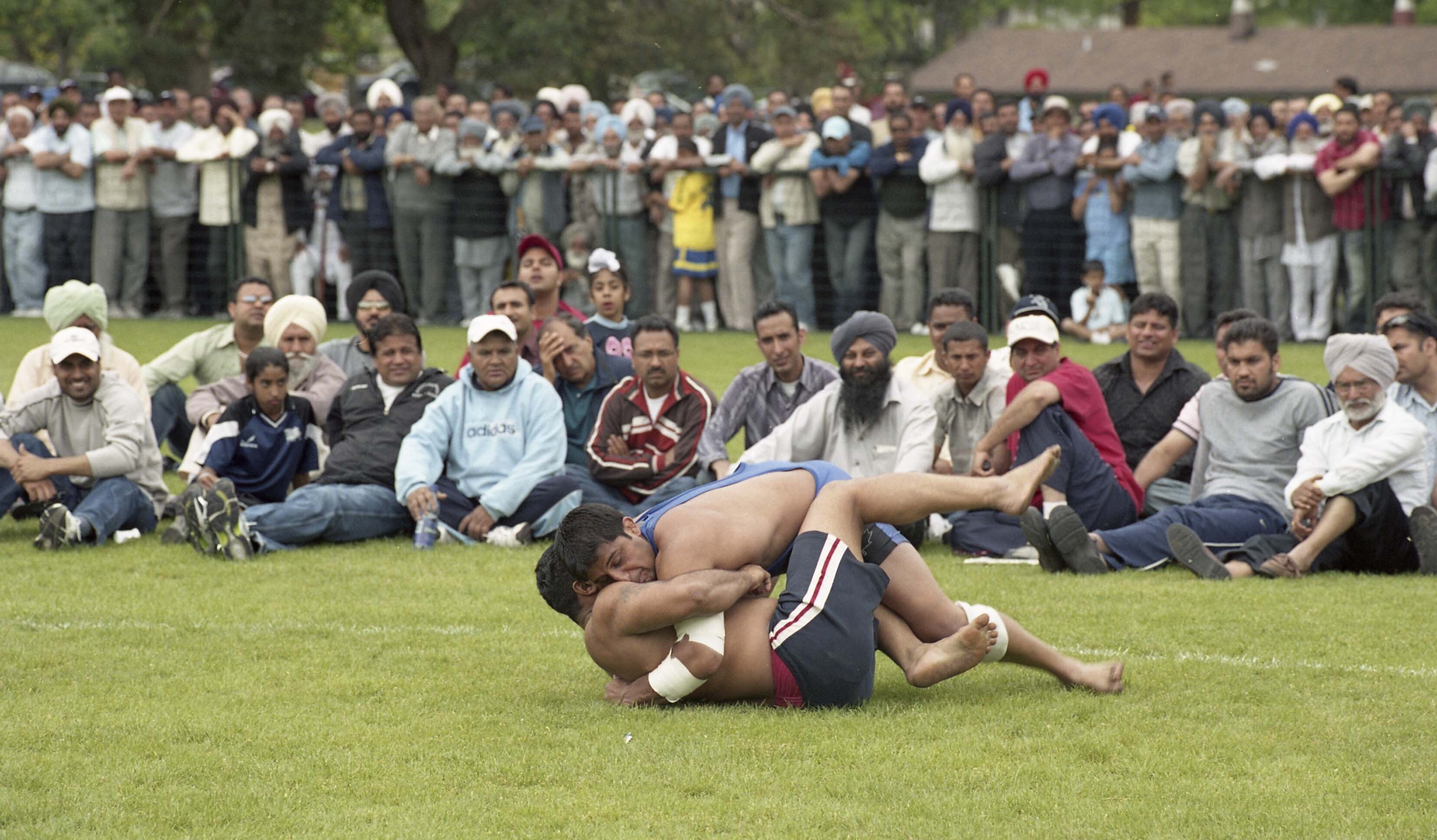 Photograph of a kabaddi player pinning down his opponent at the Khalsa Diwan Society's Annual Sports Day 2006, hosted at the Khalsa Diwan Society Gurdwara in Vancouver, B.C.