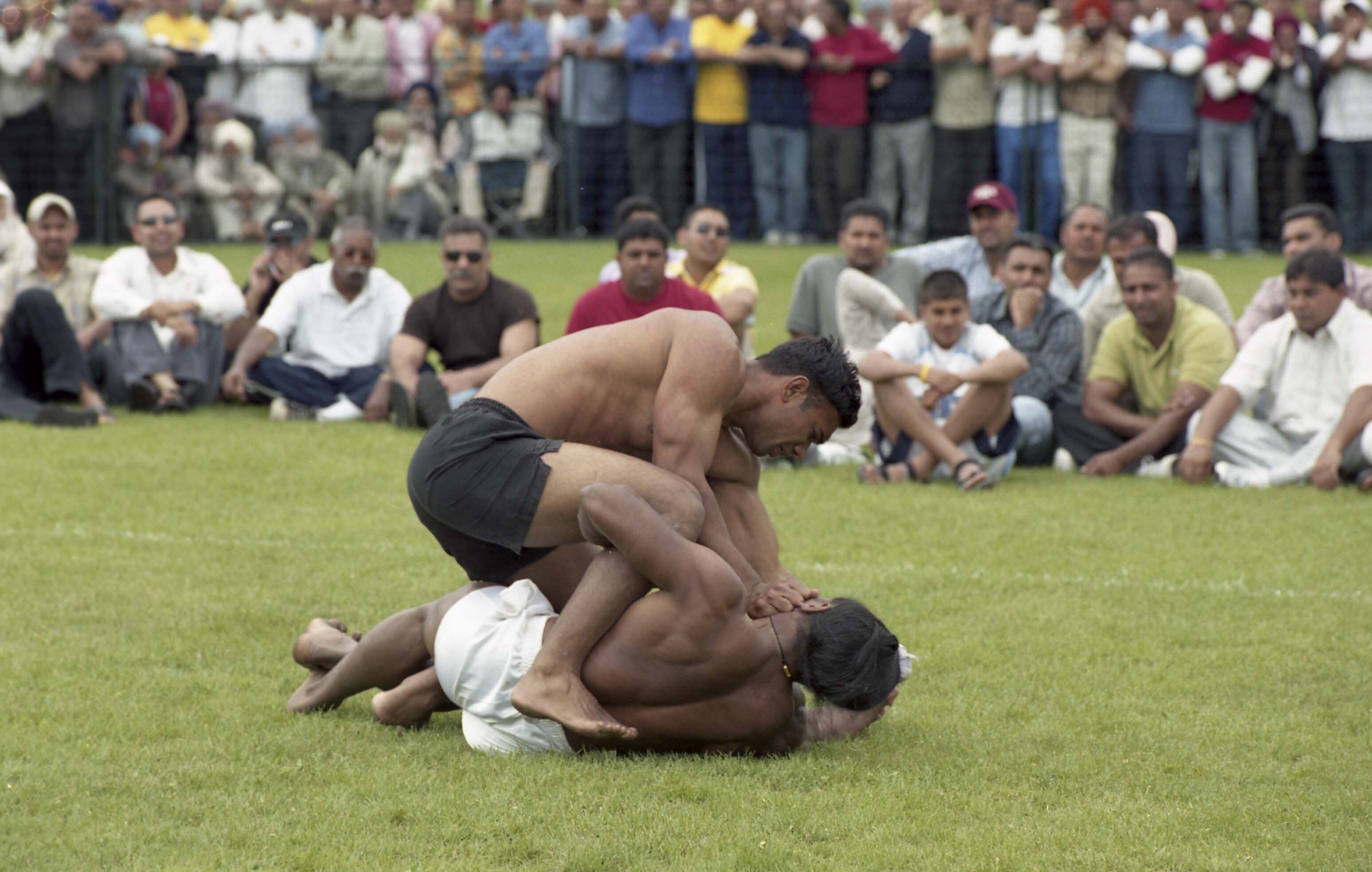 [Photograph of a kabaddi player pinning down his opponent in Vancouver]