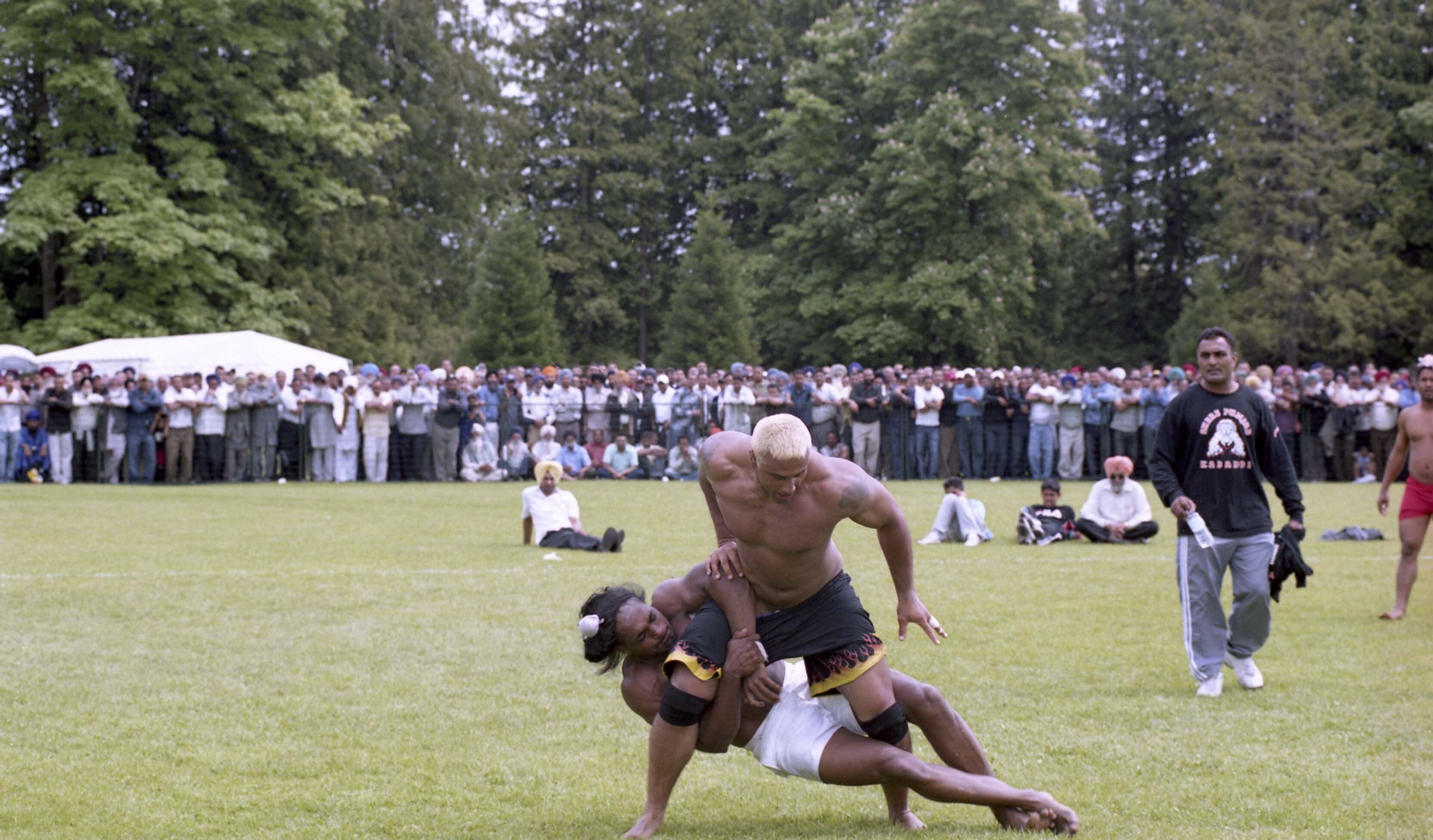 [Photograph of a kabaddi player pulling down his opponent in Vancouver]