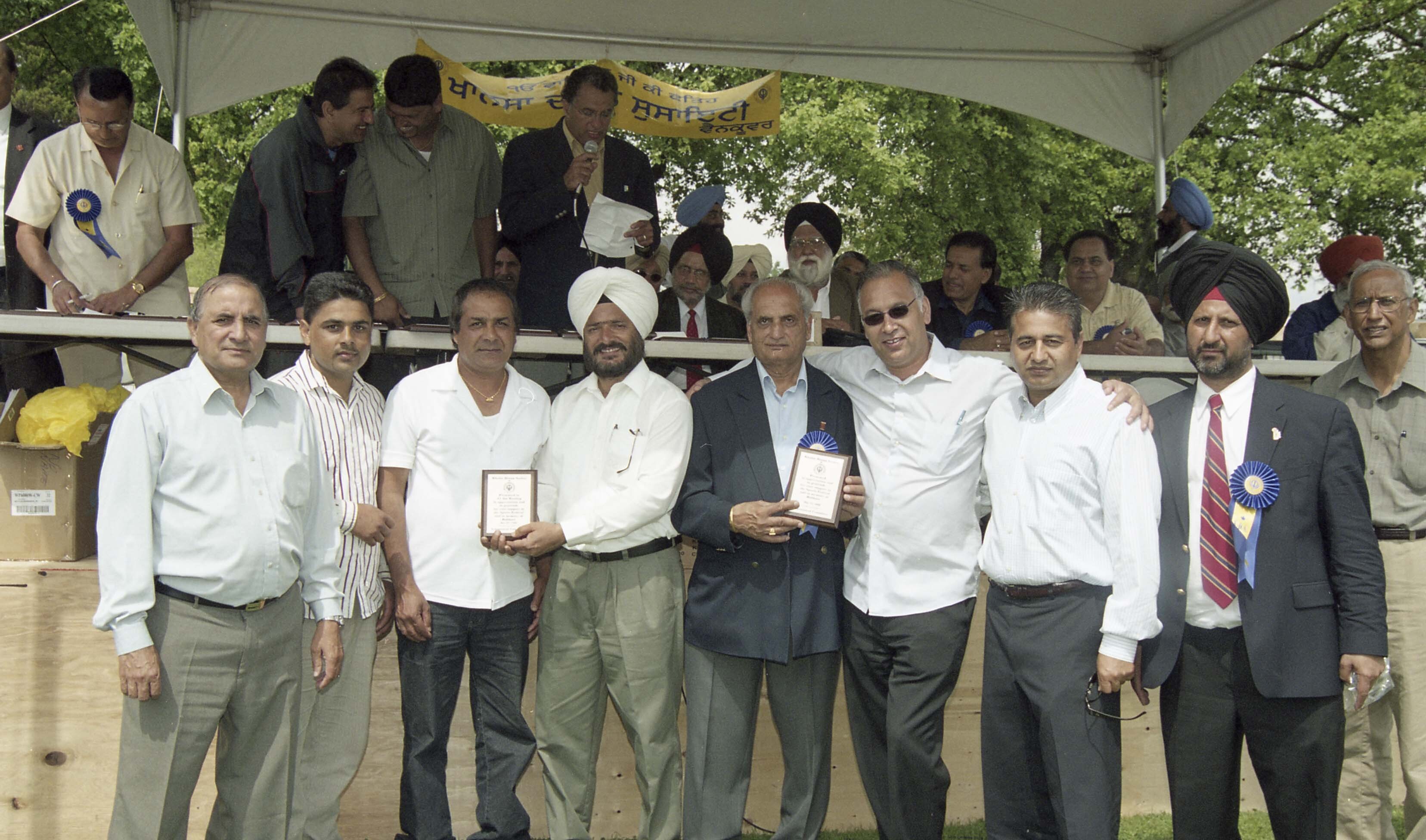 Group portrait of two unidentified men receiving a plaque at the Khalsa Diwan Society's Annual Sports Day 2006, hosted at the Khalsa Diwan Society Gurdwara in Vancouver, B.C.