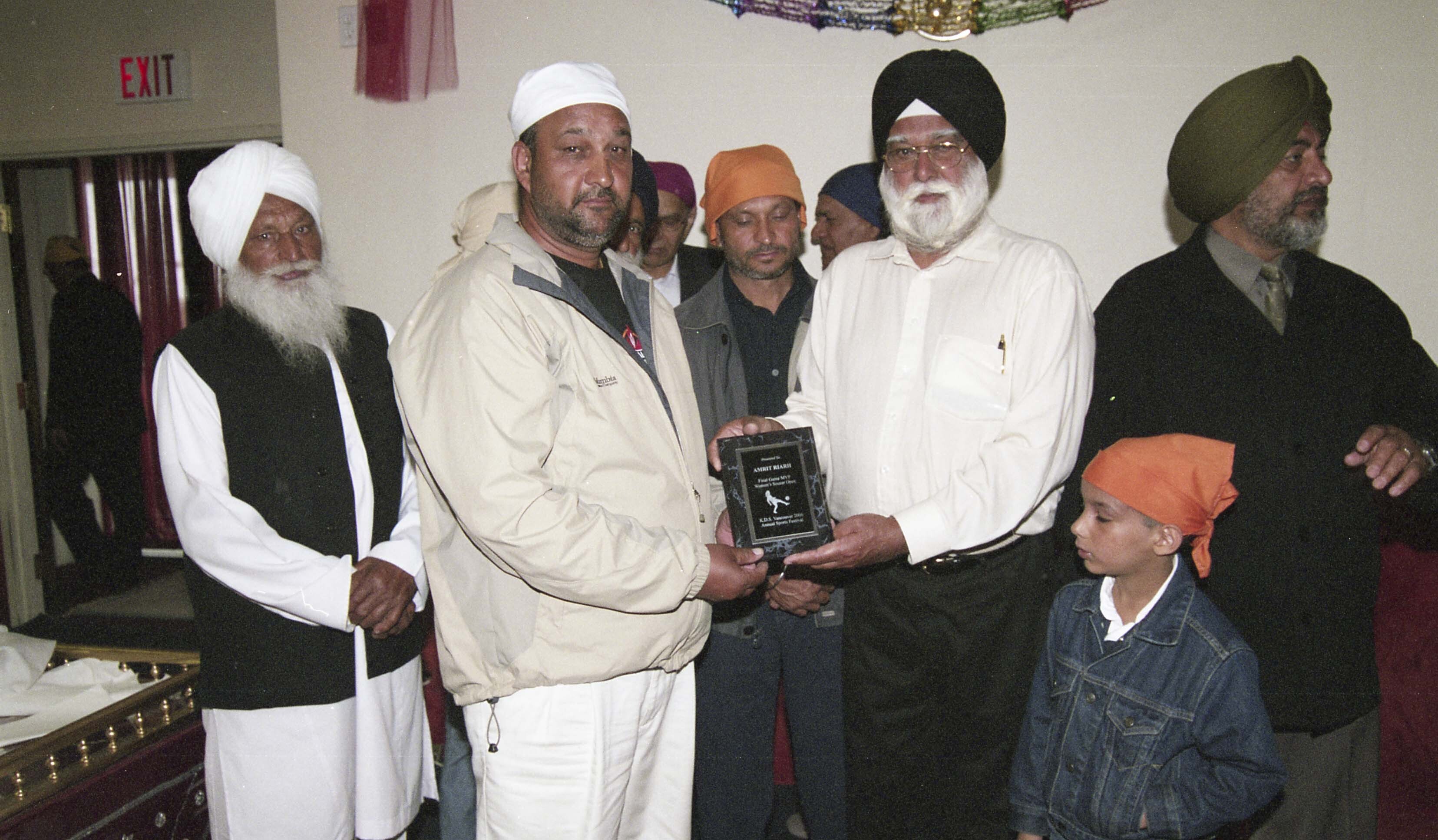Group portrait of an unidentified man receiving a plaque at the awards ceremony for the Khalsa Diwan Society's Annual Sports Day 2006, hosted at the Khalsa Diwan Society Gurdwara in Vancouver, B.C.