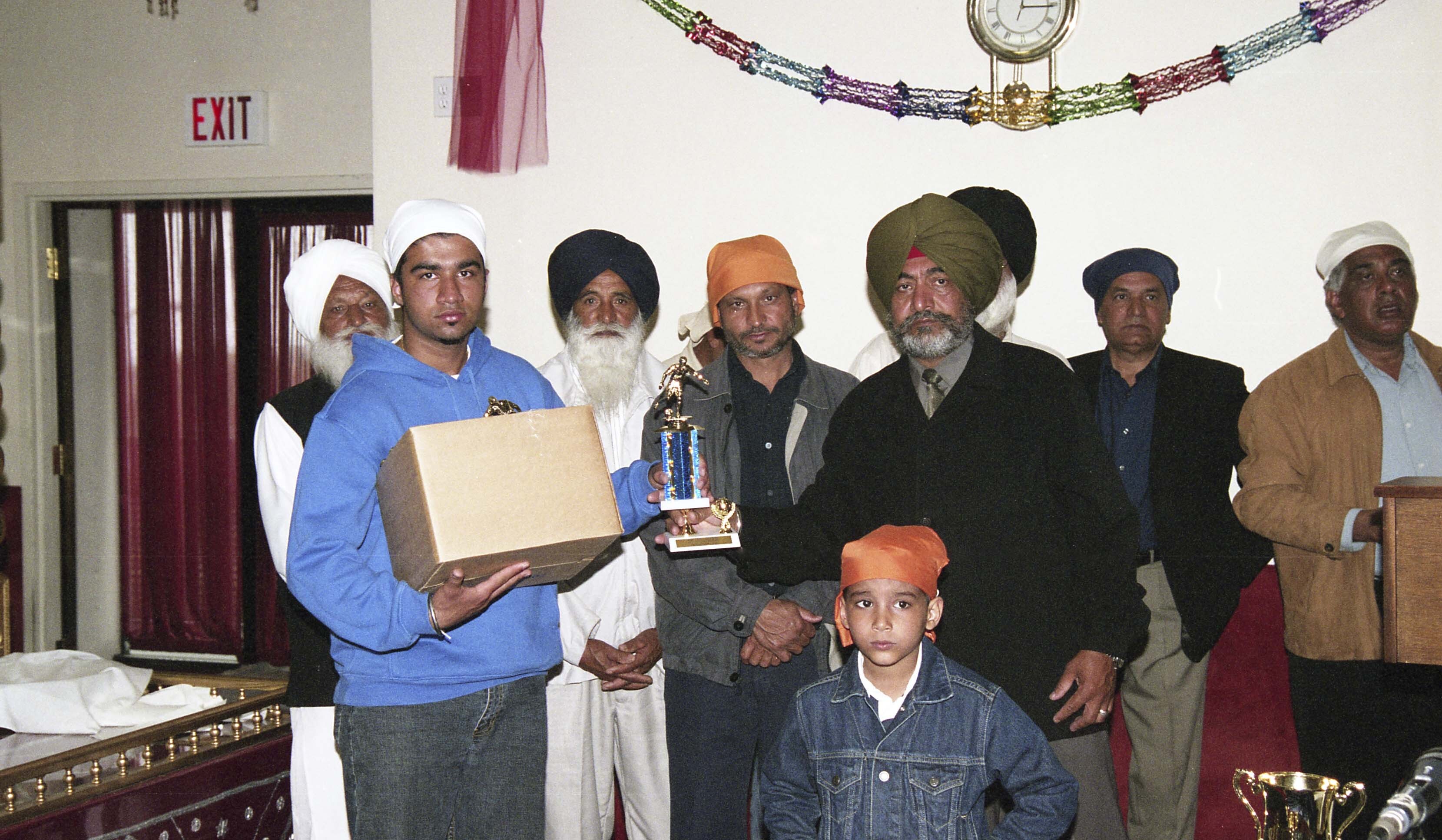 Group portrait of an unidentified man receiving a trophy at the awards ceremony for the Khalsa Diwan Society's Annual Sports Day 2006, hosted at the Khalsa Diwan Society Gurdwara in Vancouver, B.C.