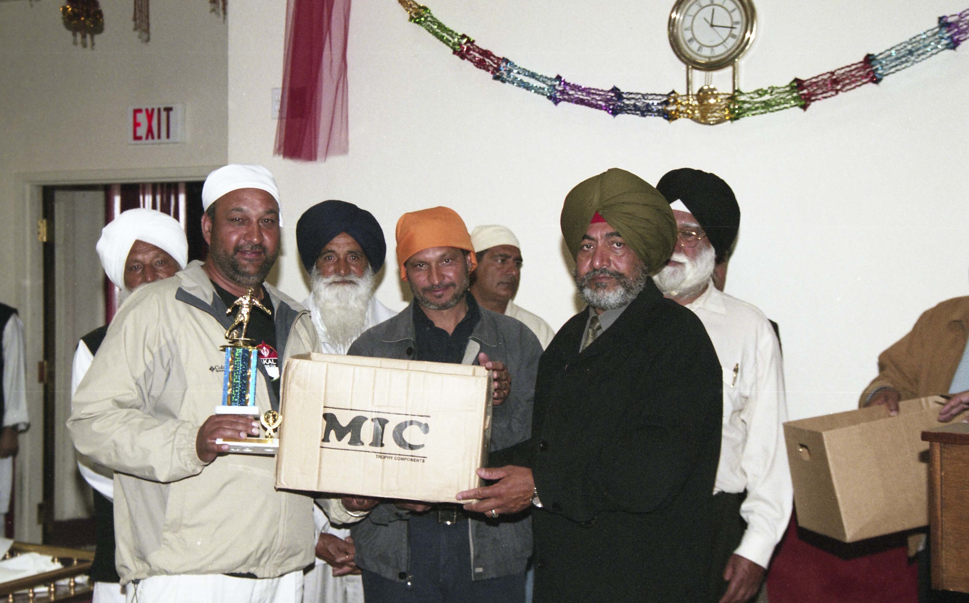 Group portrait of an unidentified man receiving a trophy at the awards ceremony for the Khalsa Diwan Society's Annual Sports Day 2006, hosted at the Khalsa Diwan Society Gurdwara in Vancouver, B.C.