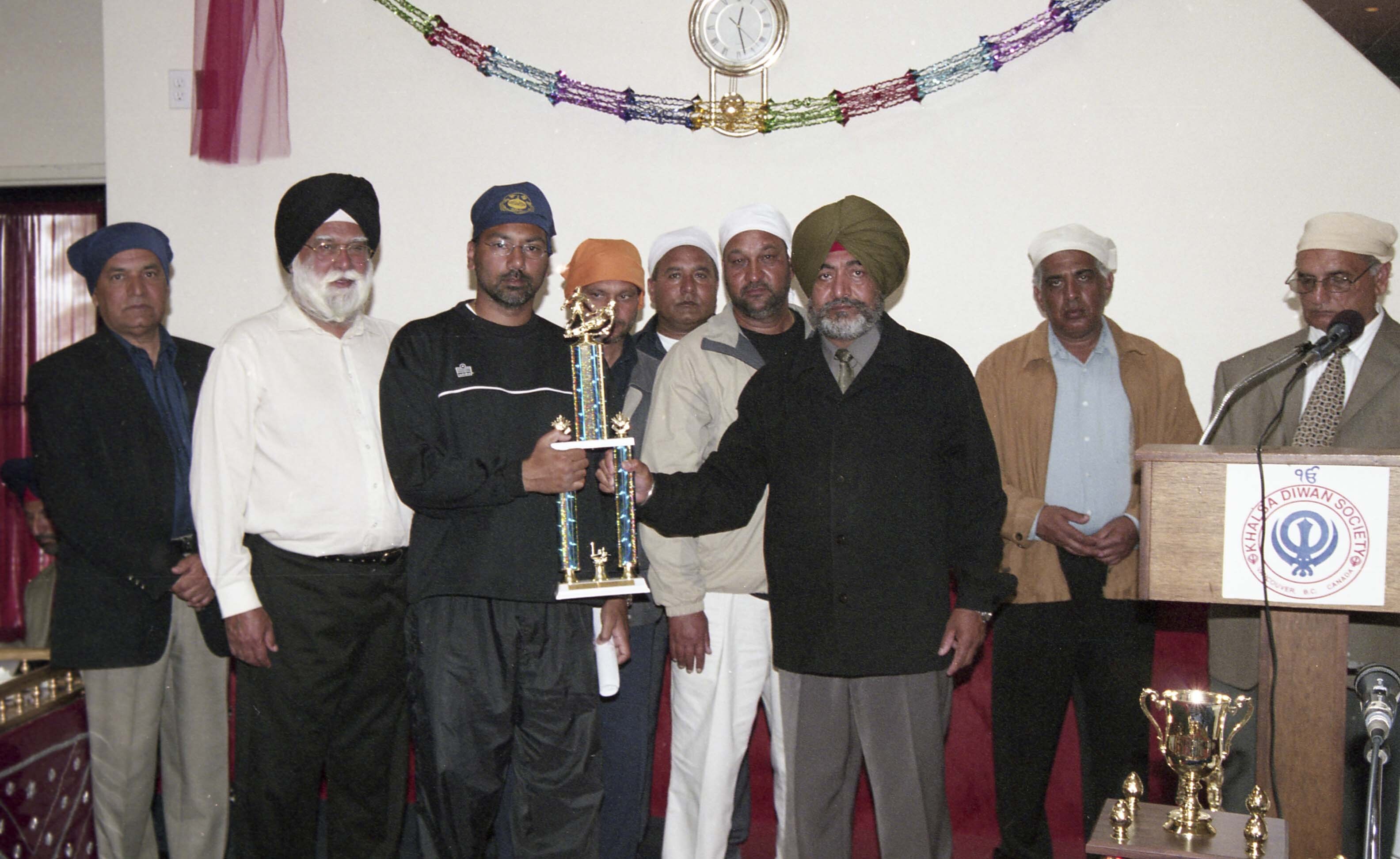 Group portrait of unidentified man receiving a trophy at the awards ceremony for the Khalsa Diwan Society's Annual Sports Day 2006, hosted at the Khalsa Diwan Society Gurdwara in Vancouver, B.C.