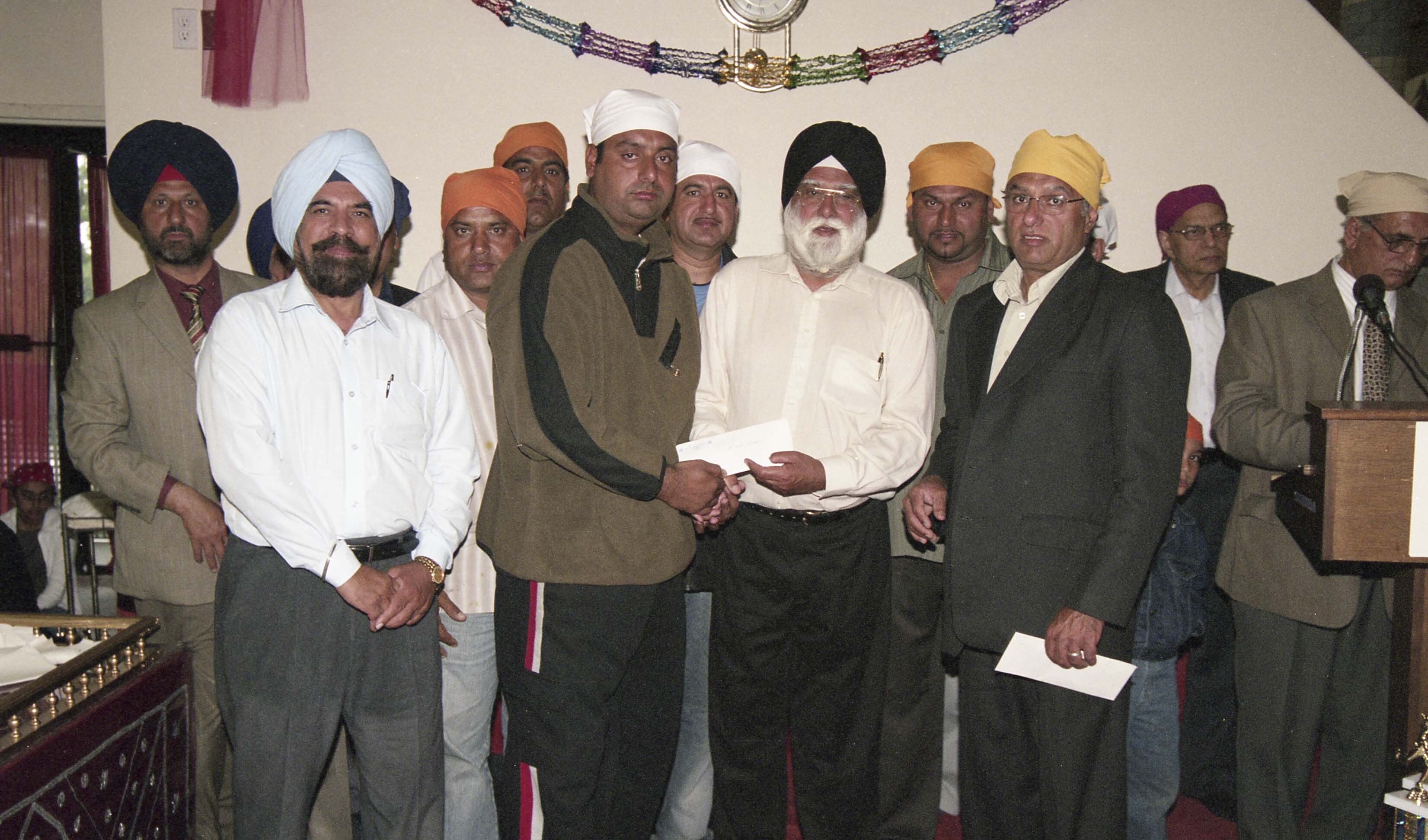 Group portrait of an unidentified man receiving an envelope at the awards ceremony for the Khalsa Diwan Society's Annual Sports Day 2006, hosted at the Khalsa Diwan Society Gurdwara in Vancouver, B.C.
