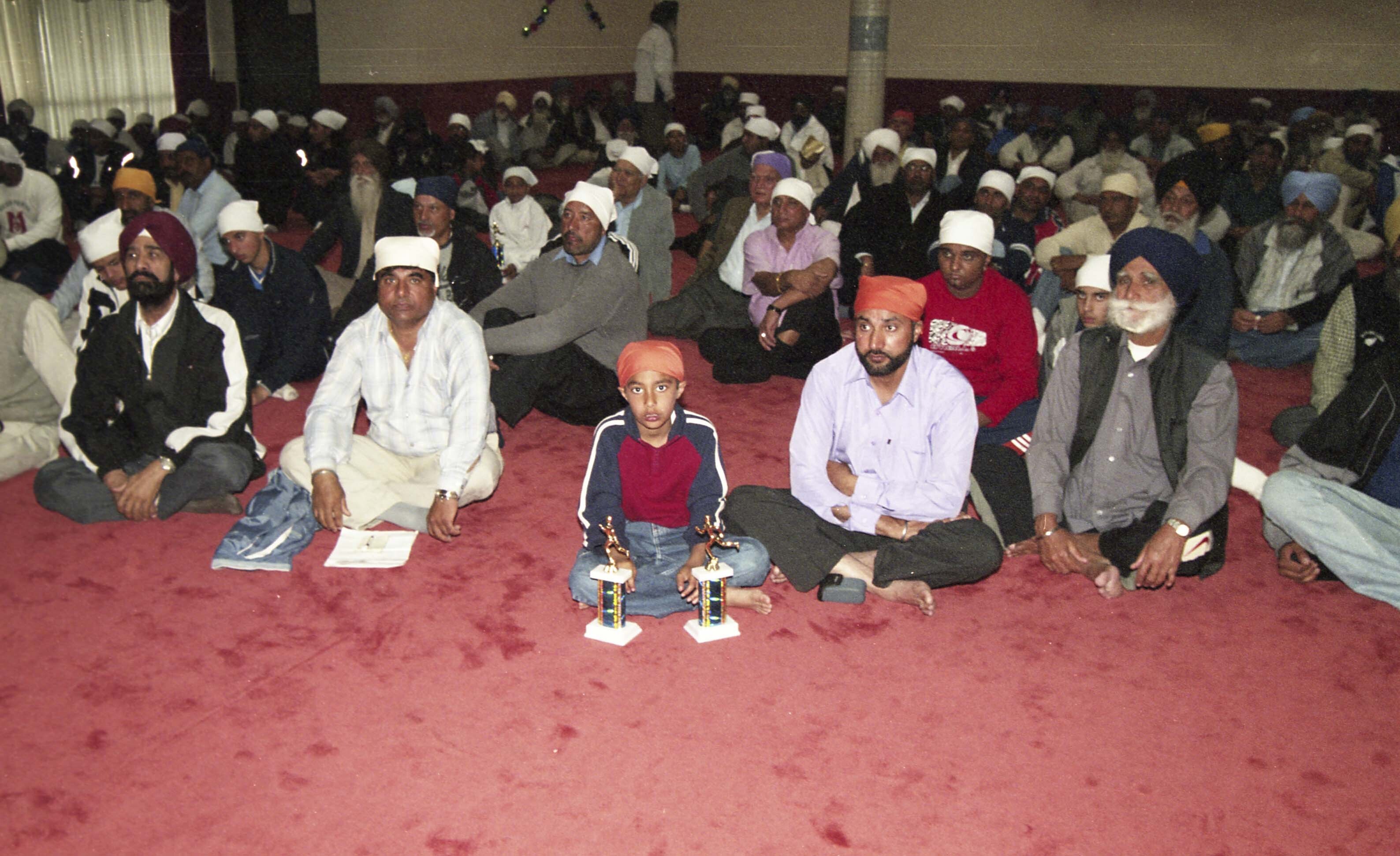 [Photograph of a child with trophies in gurdwara in Vancouver]