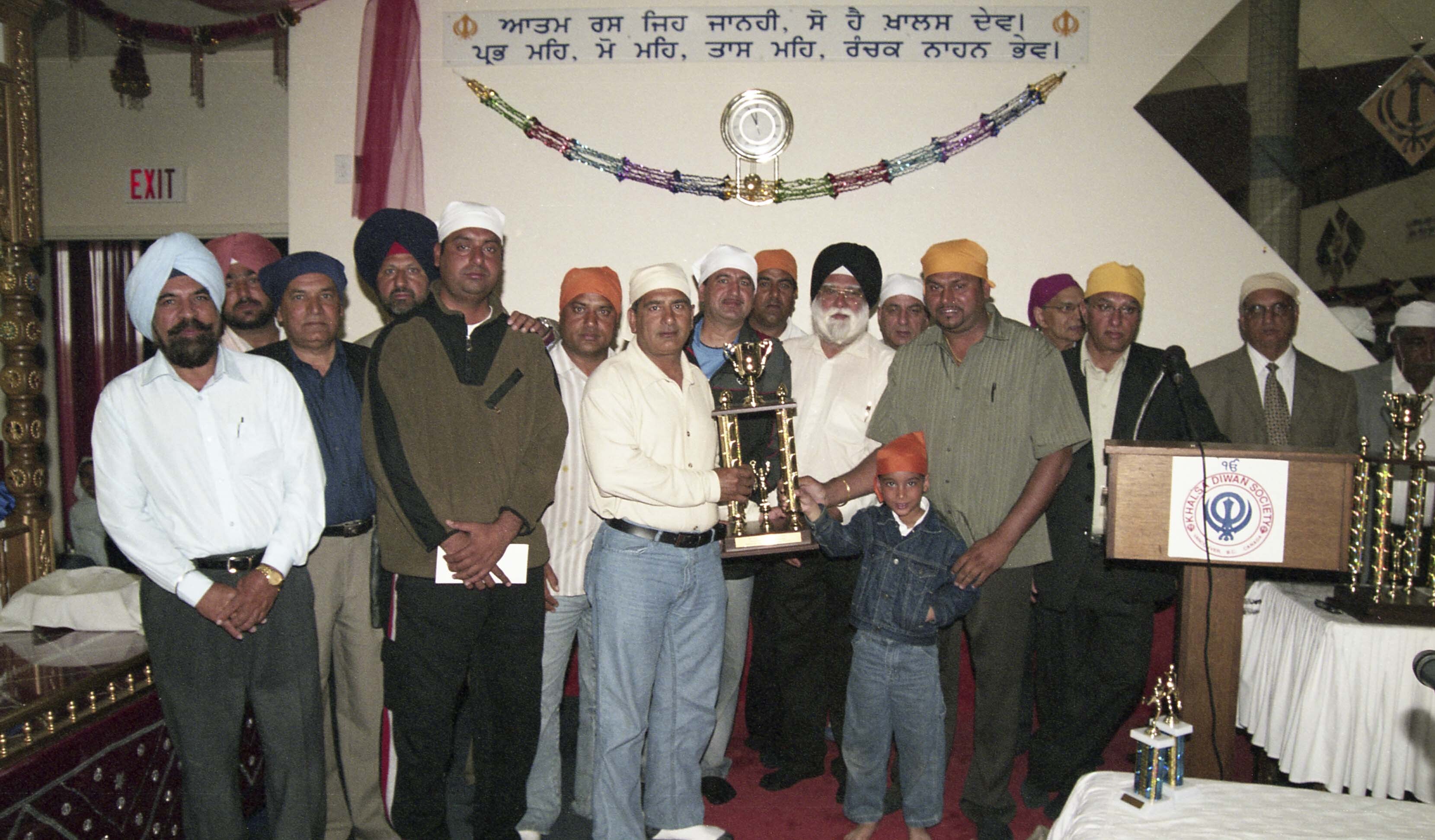 Group portrait of unidentified men with a large trophy at the awards ceremony for the Khalsa Diwan Society's Annual Sports Day 2006, hosted at the Khalsa Diwan Society Gurdwara in Vancouver, B.C.