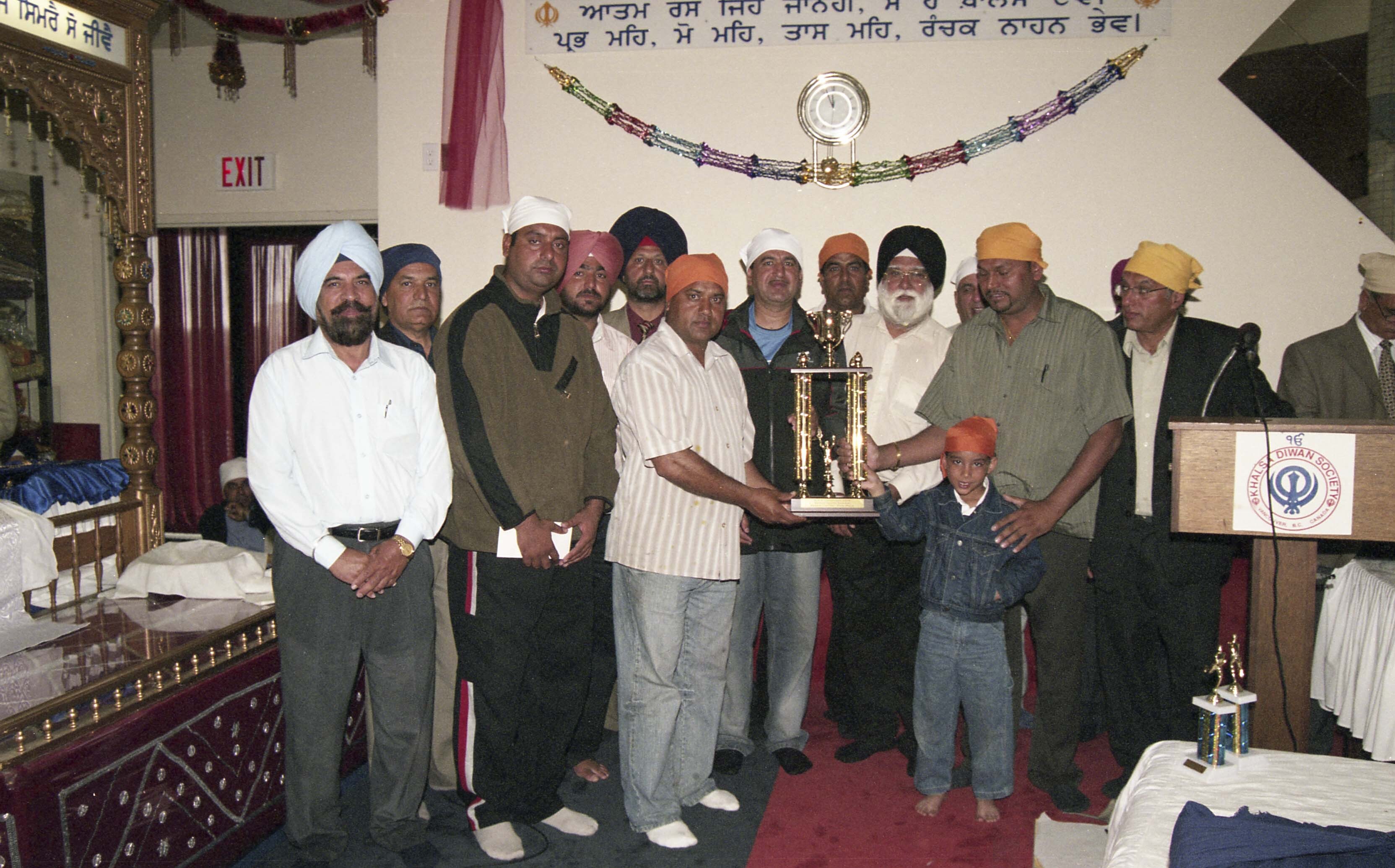 Group portrait of unidentified men with a large trophy at the awards ceremony for the Khalsa Diwan Society's Annual Sports Day 2006, hosted at the Khalsa Diwan Society Gurdwara in Vancouver, B.C.