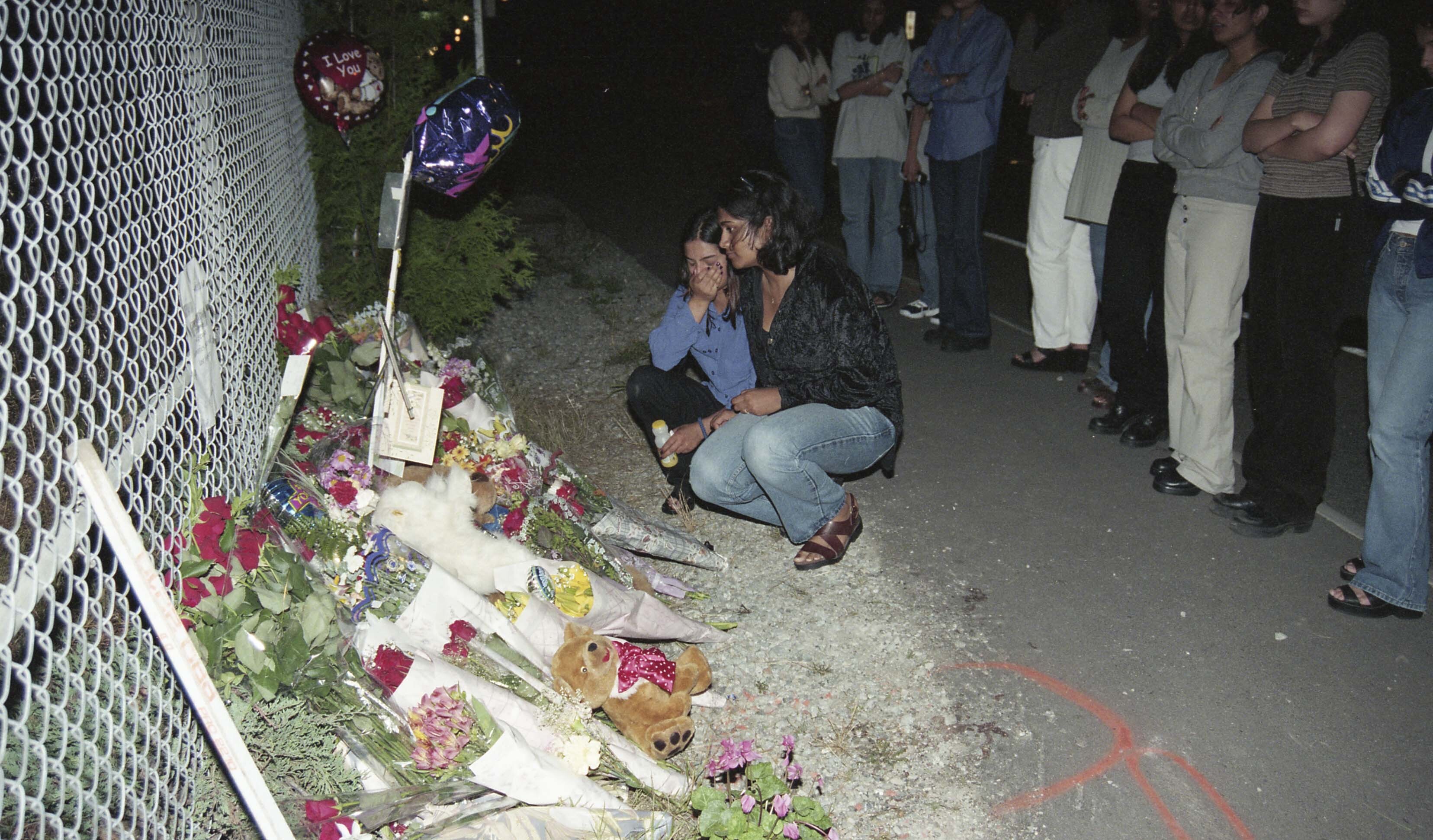 Photograph of unidentified individuals presenting flowers at Terry Sidhu's memorial site in Burnaby, B.C.
