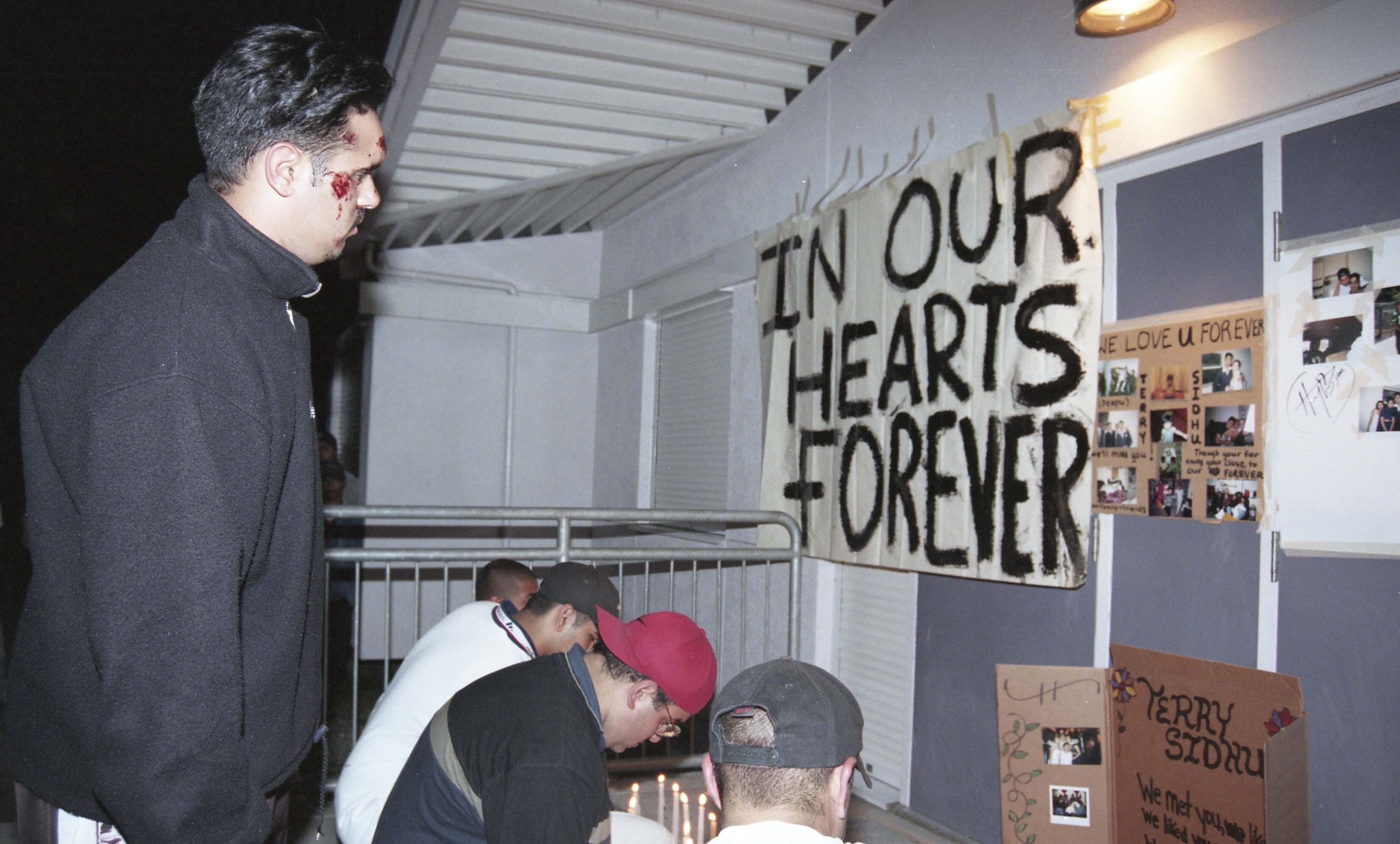 Photograph of unidentified individuals presenting candles at Terry Sidhu's memorial site in Burnaby, B.C.