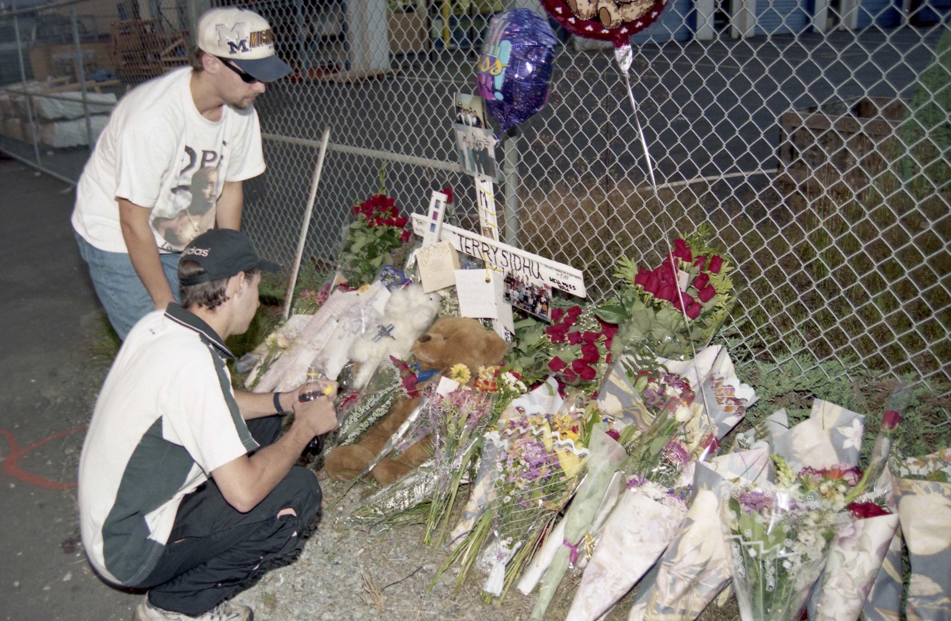 Photograph of unidentified individuals presenting flowers at Terry Sidhu's memorial site in Burnaby, B.C.