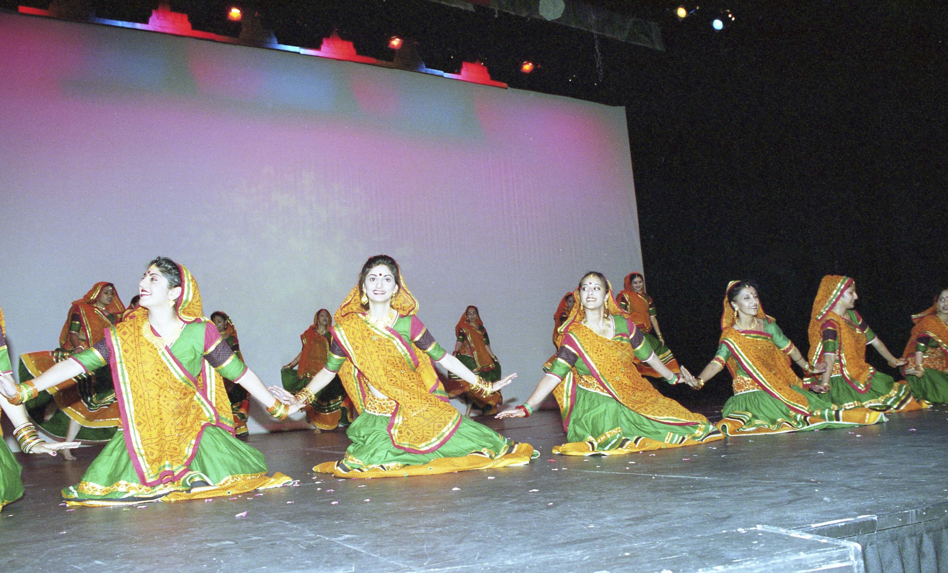 Photograph of a dance performance at an awards and dance event hosted by the Gujarati Society of British Columbia, hosted at Burnaby South Secondary School in Burnaby, B.C.