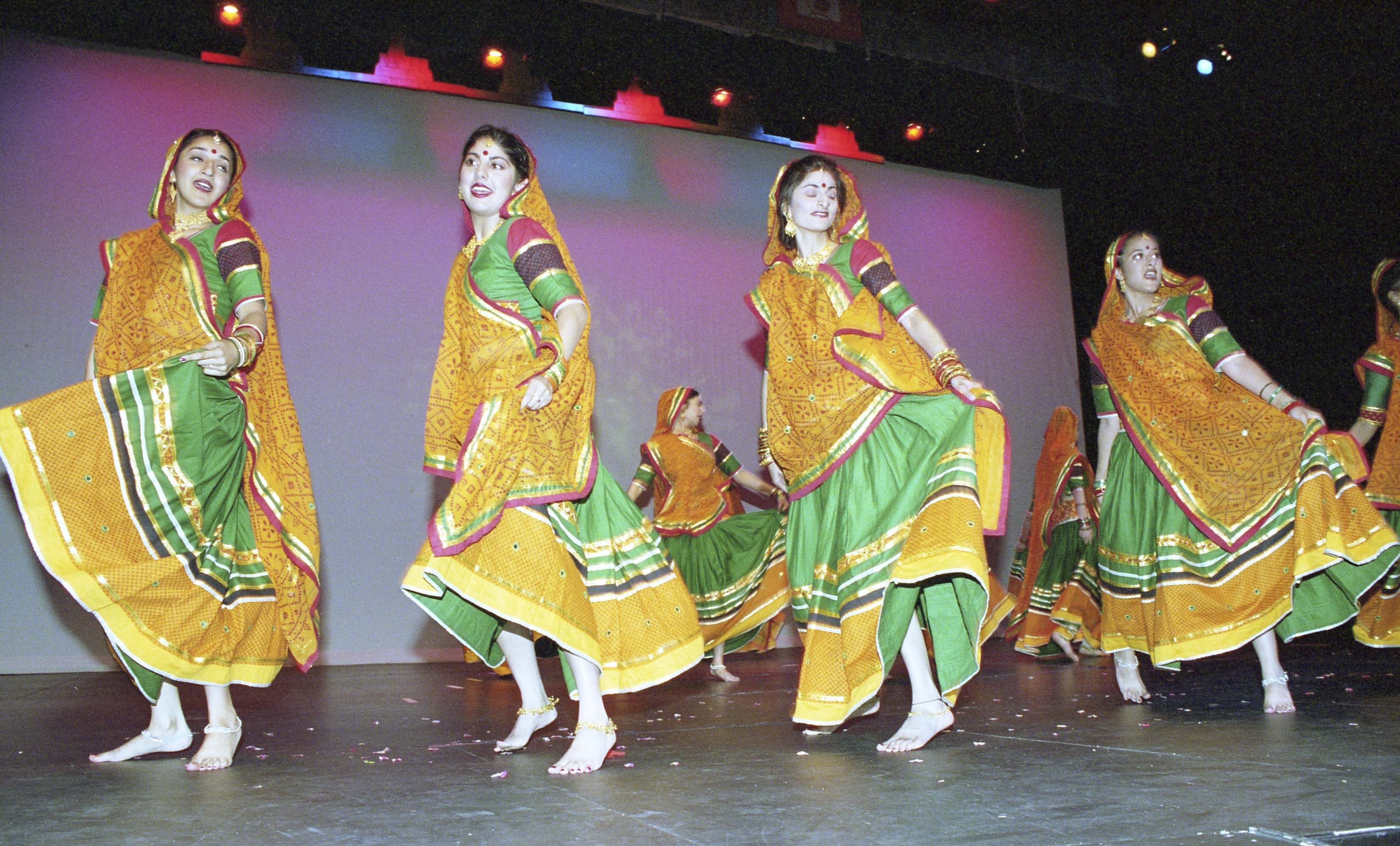 Photograph of a dance performance at an awards and dance event hosted by the Gujarati Society of British Columbia, hosted at Burnaby South Secondary School in Burnaby, B.C.