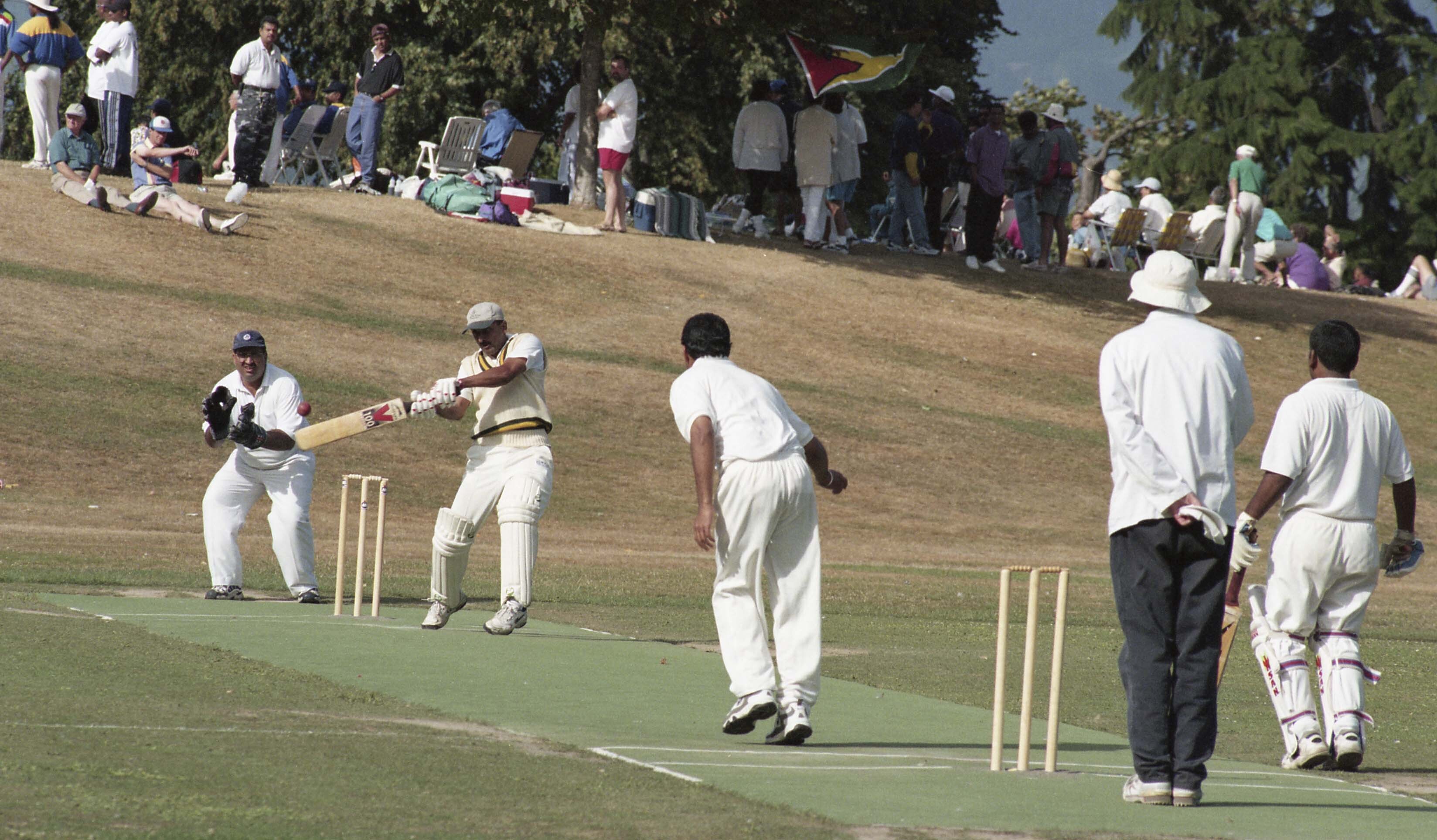 Photograph of a cricket match outside the Brockton Clubhouse in Vancouver, B.C.