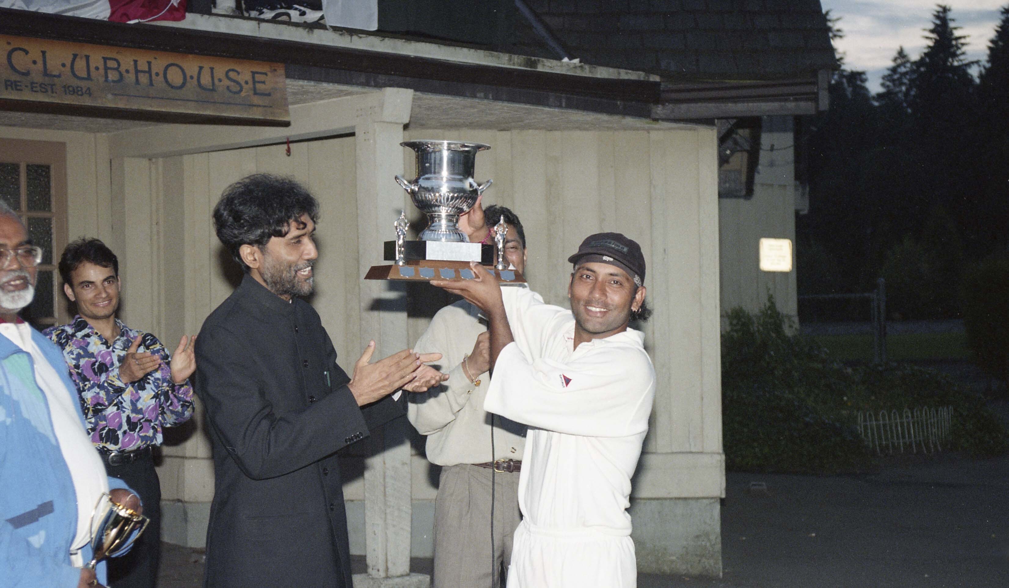 [Photograph of a cricketer with the Golden Jubilee Cup in Vancouver]