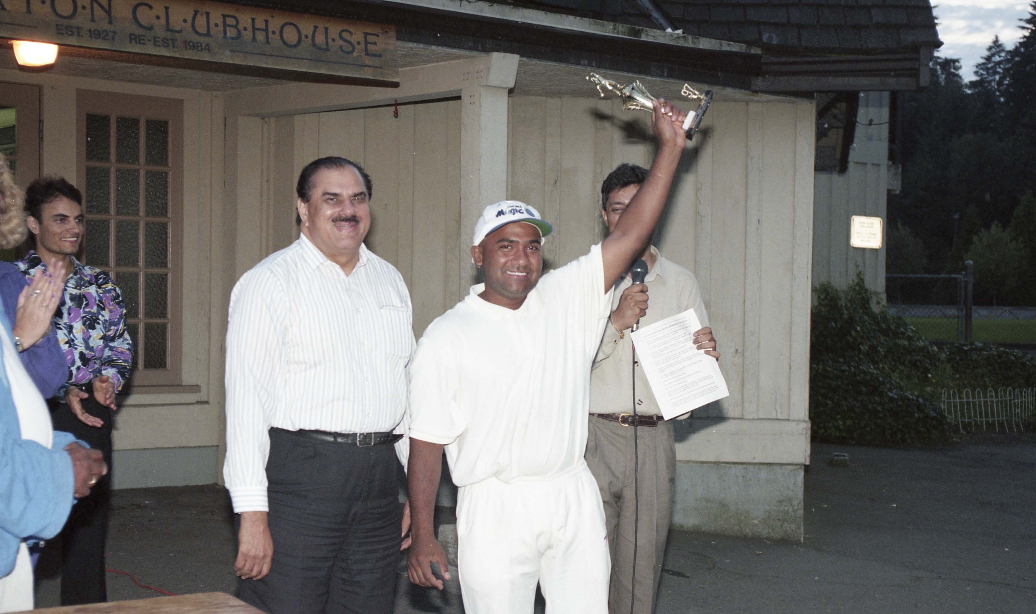 [Photograph of a cricketer with trophies in Vancouver]