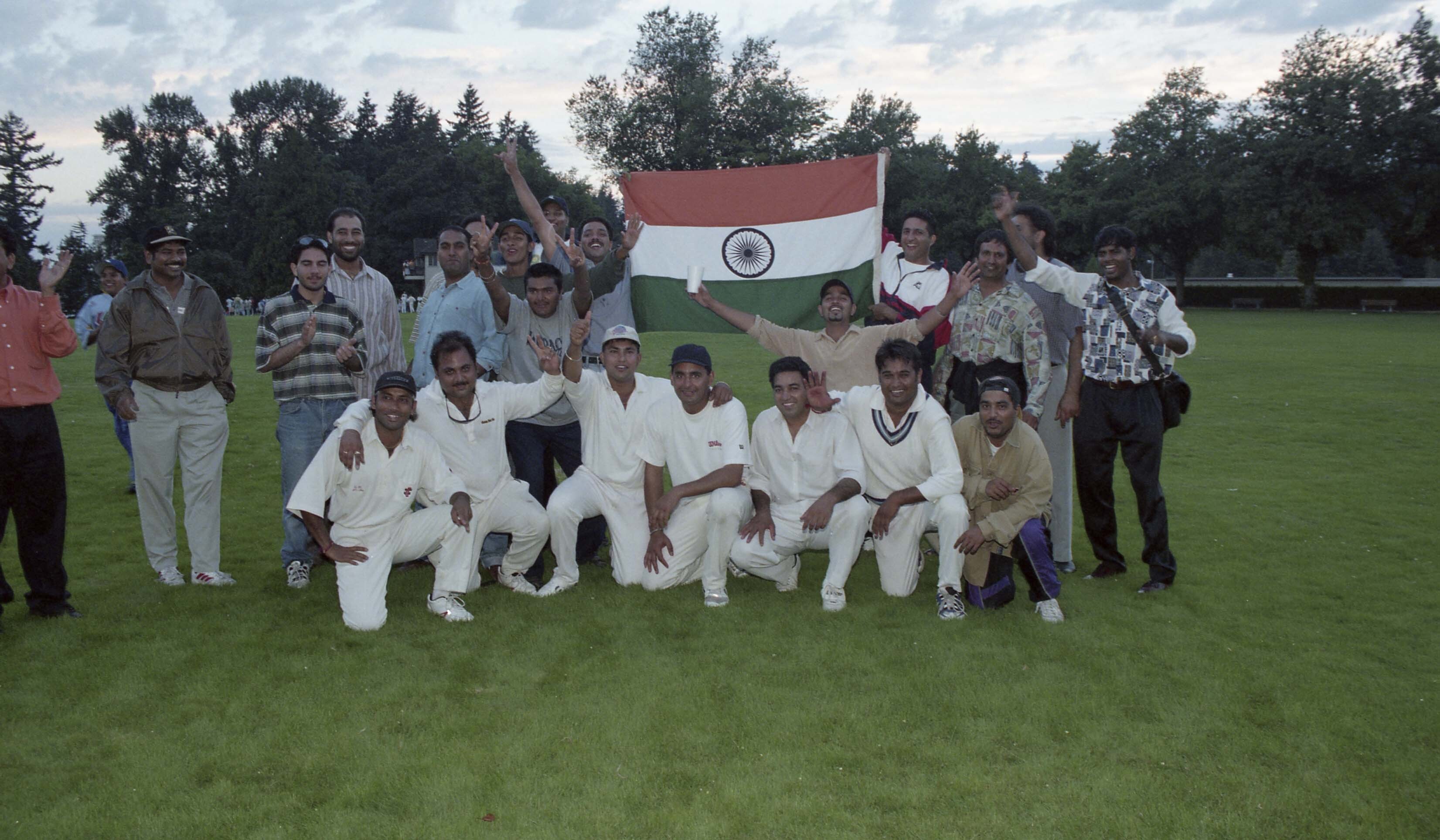 [Group portrait of cricketers with the flag of India in Vancouver]