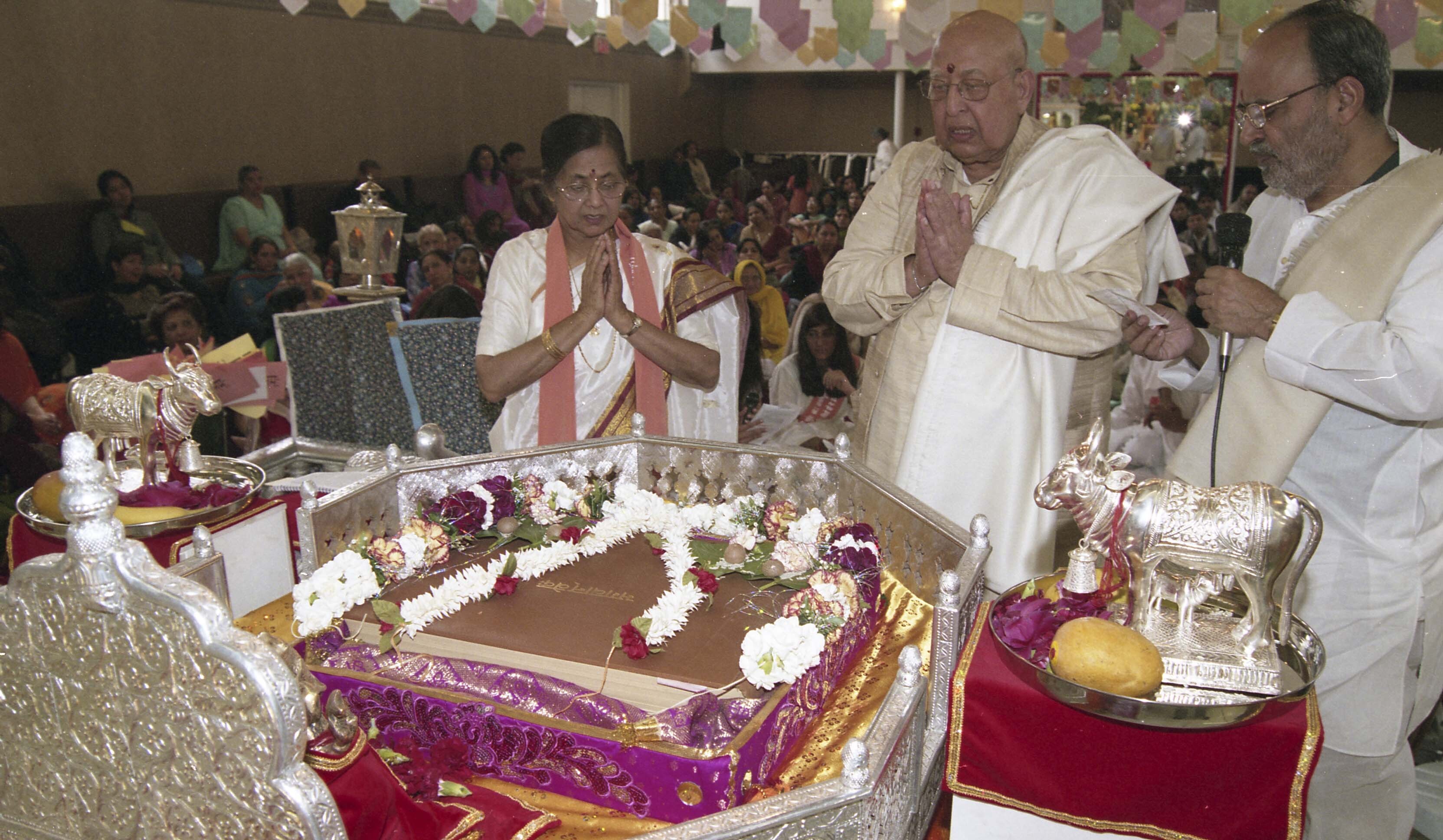Photograph of an installation ceremony (sthapana) for a holy book, The Veda, at the Hindu Cultural Society and Community Centre of B.C. in Burnaby, B.C.