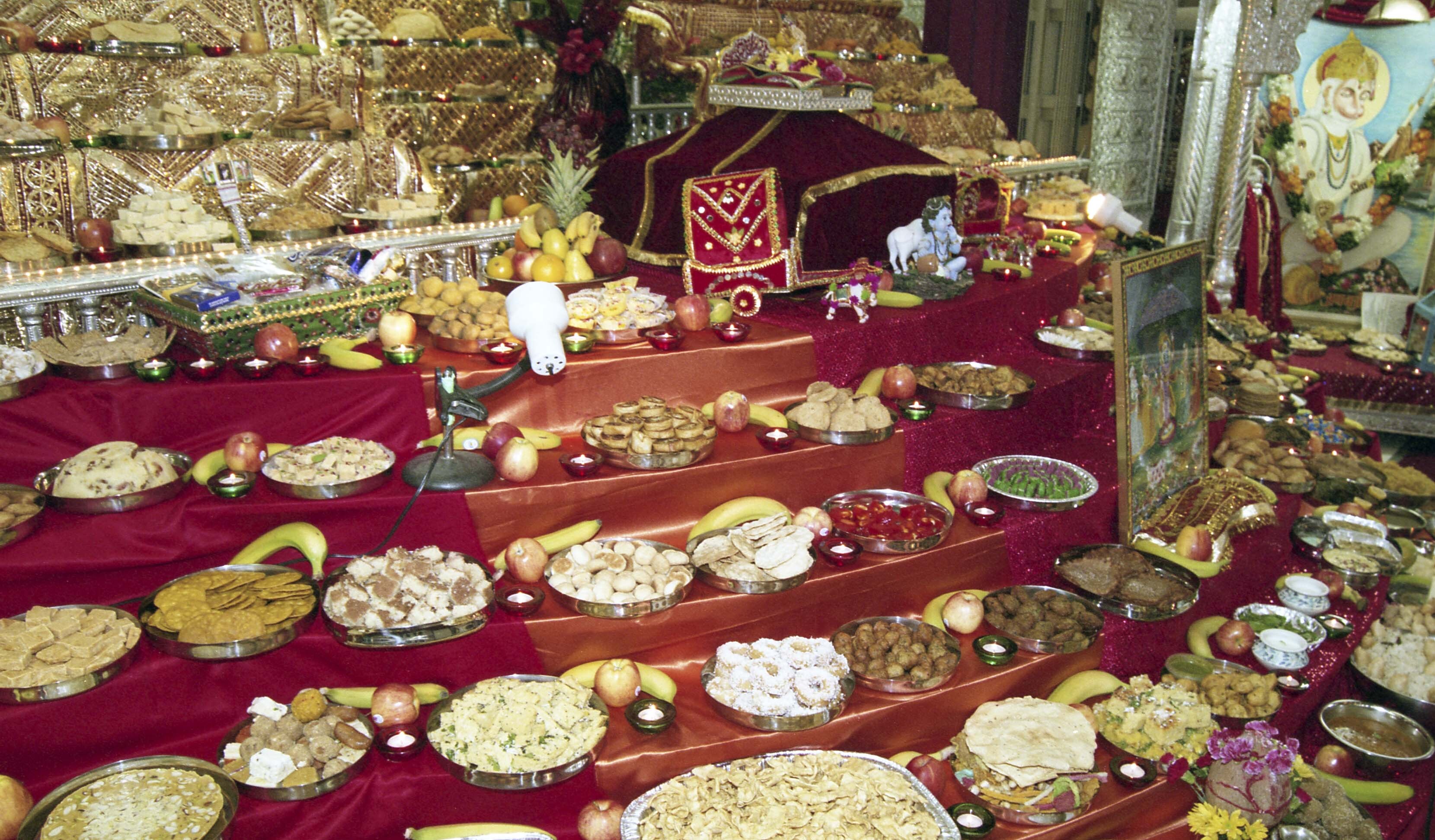 Govardhan Puja or Annakut, meaning "mountain of food," is a Hindu festival to celebrate the child form (baal roop) of Lord Shri Krishna. This festival occurs the day after Diwali, on the first lunar day of the bright fortnight of the month of Kartika. During this celebration, devotees offer various food and sweet items to deities.