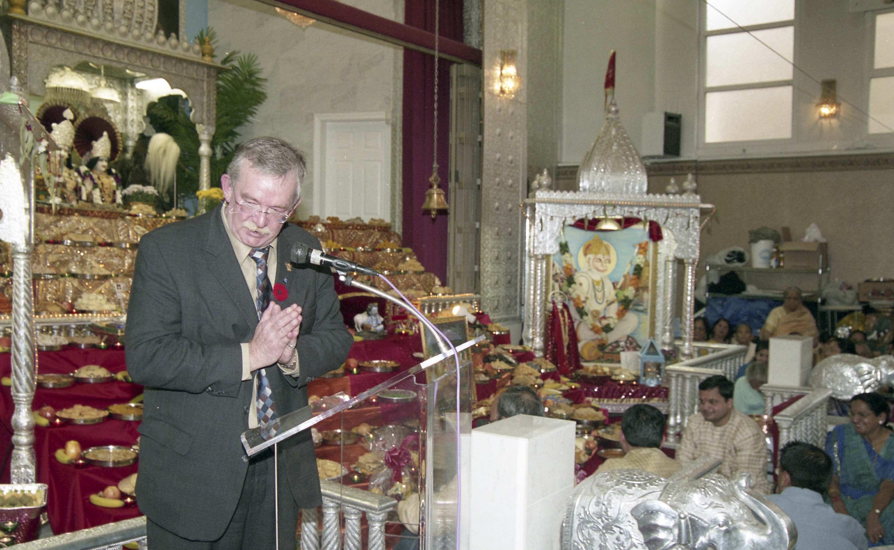 Photograph of a man giving an address at a Govardhan Puja celebration at the Hindu Cultural Society and Community Centre of B.C. in Burnaby, B.C.