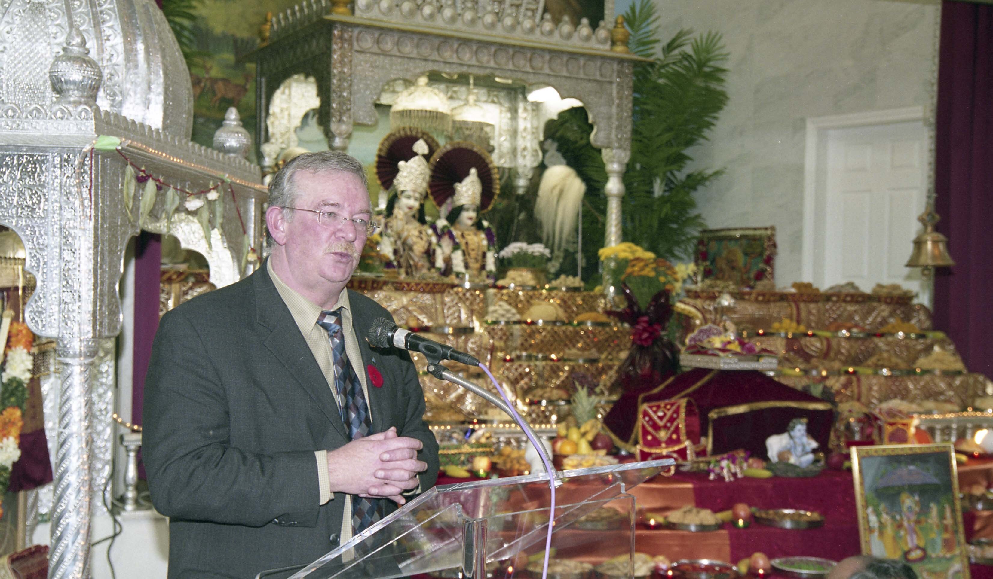 Photograph of a man giving an address at a Govardhan Puja celebration at the Hindu Cultural Society and Community Centre of B.C. in Burnaby, B.C.