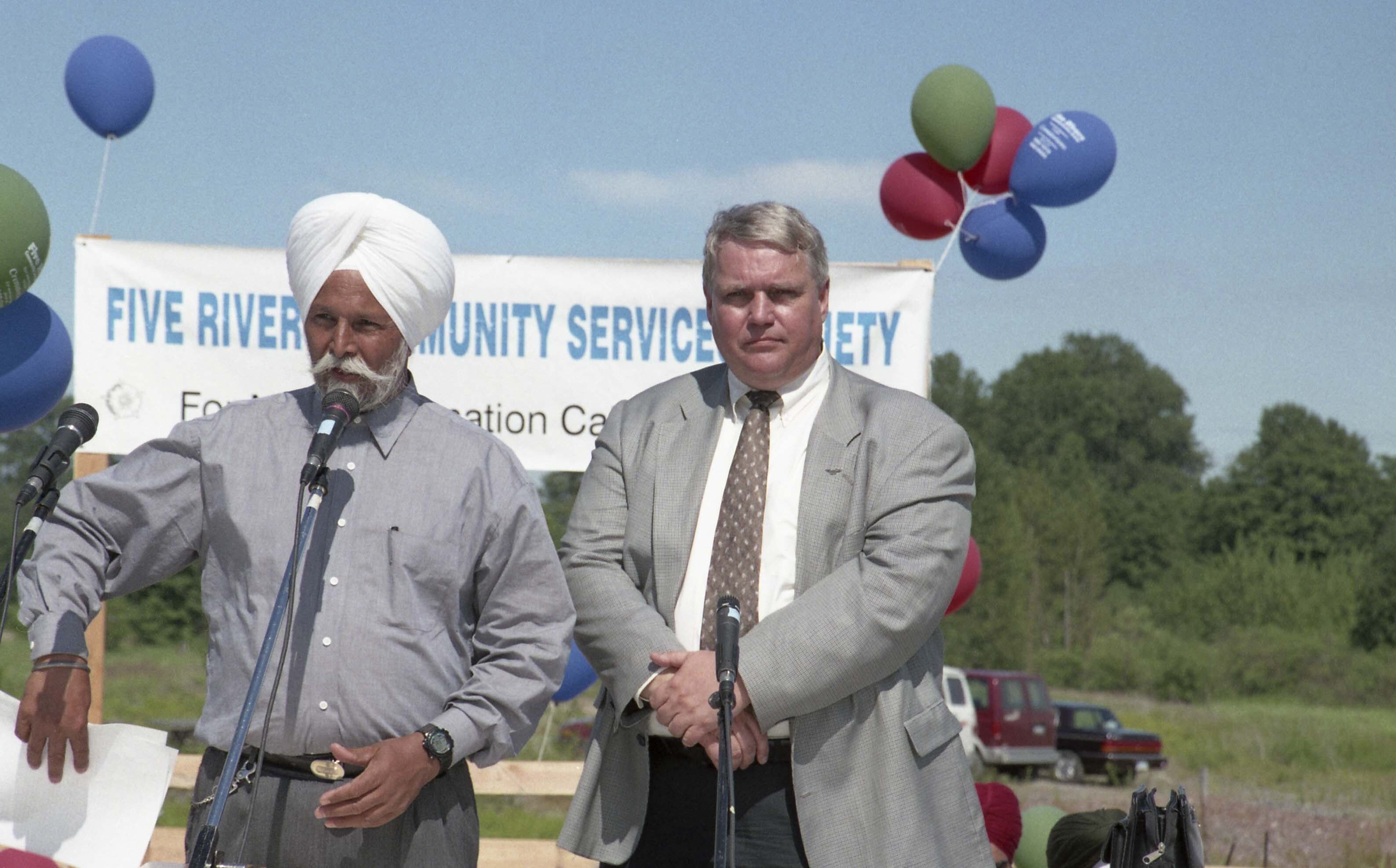 Photograph of unidentified individuals delivering a speech at the Riverside Funeral Home & Crematorium Foundation laying ceremony in Delta, British Columbia (B.C.), organised by the Five Rivers Community Services Society.