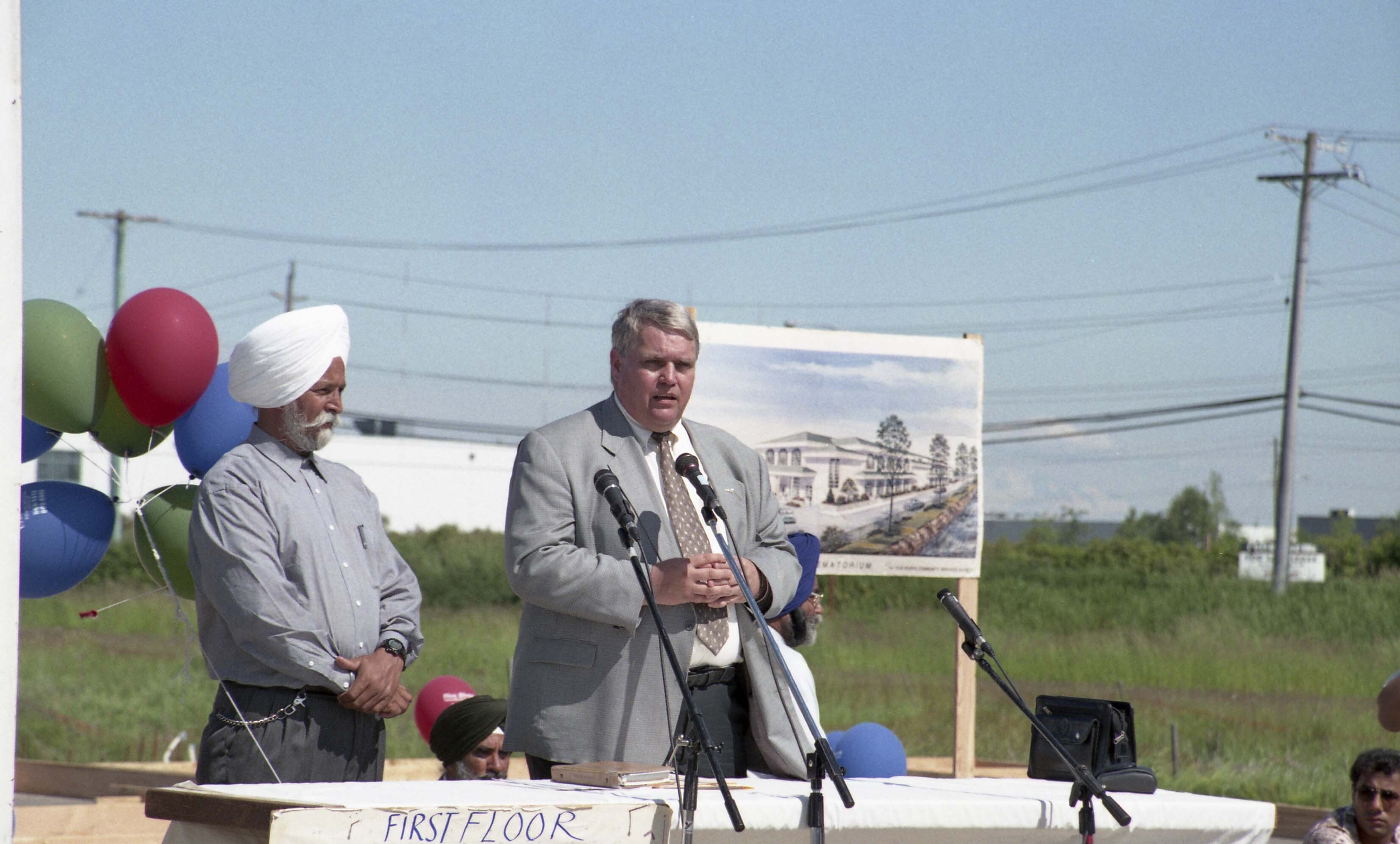 Photograph of unidentified individuals delivering a speech at the Riverside Funeral Home & Crematorium Foundation laying ceremony in Delta, British Columbia (B.C.), organised by the Five Rivers Community Services Society.