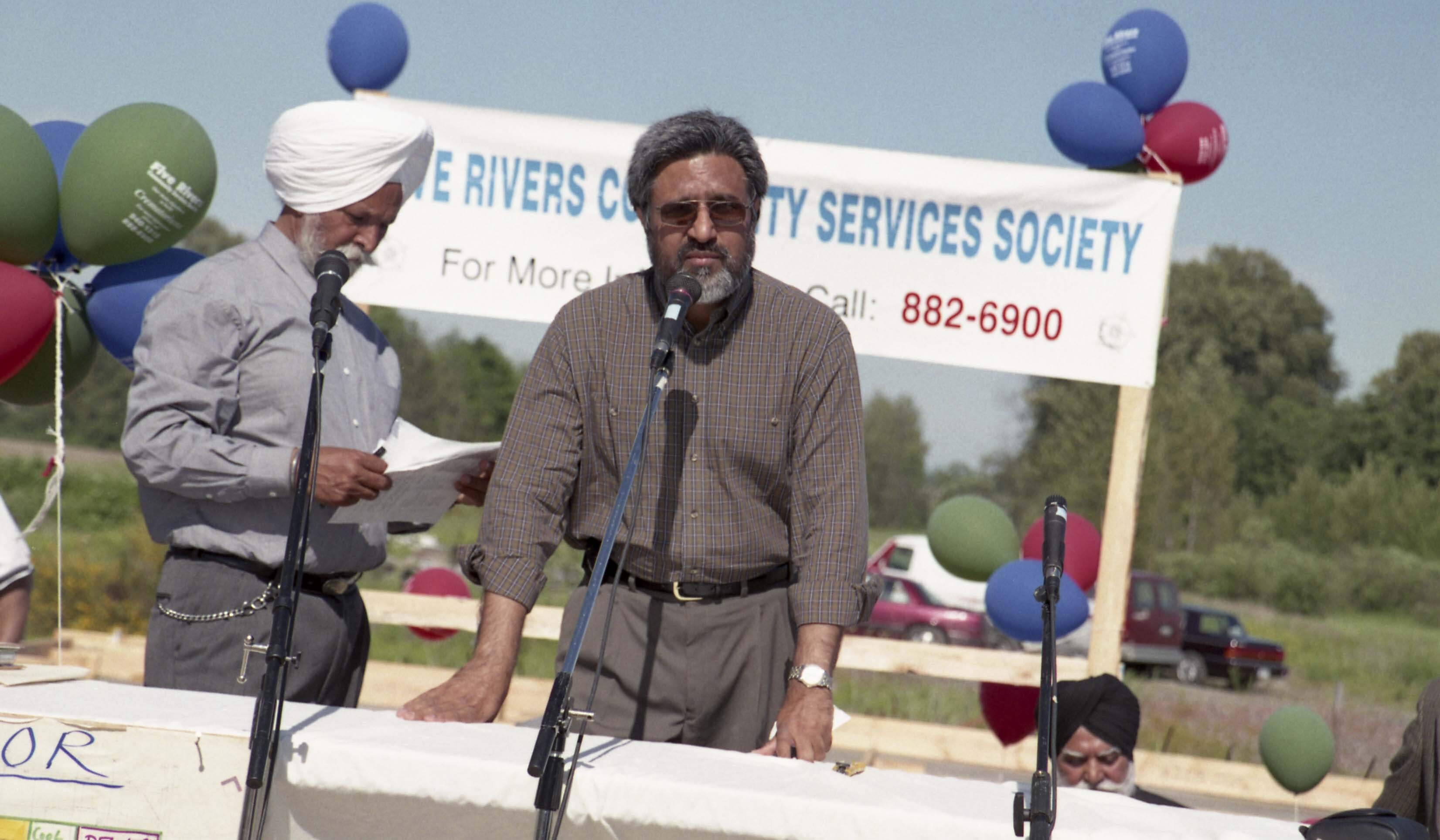 Photograph of Dr. Gulzar Cheema delivering a speech at the Riverside Funeral Home & Crematorium Foundation laying ceremony in Delta, British Columbia (B.C.), organised by the Five Rivers Community Services Society.