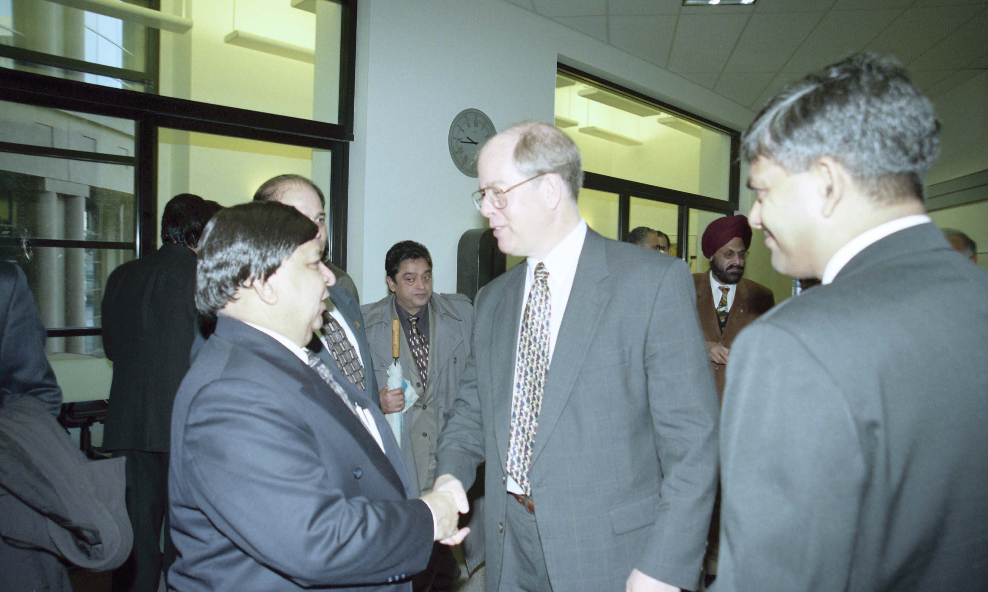 Photograph of a group of unidentified political figures greeting each other at a conference organized by the Immigration and Refugee Board of Canada [?] in Vancouver, British Columbia.