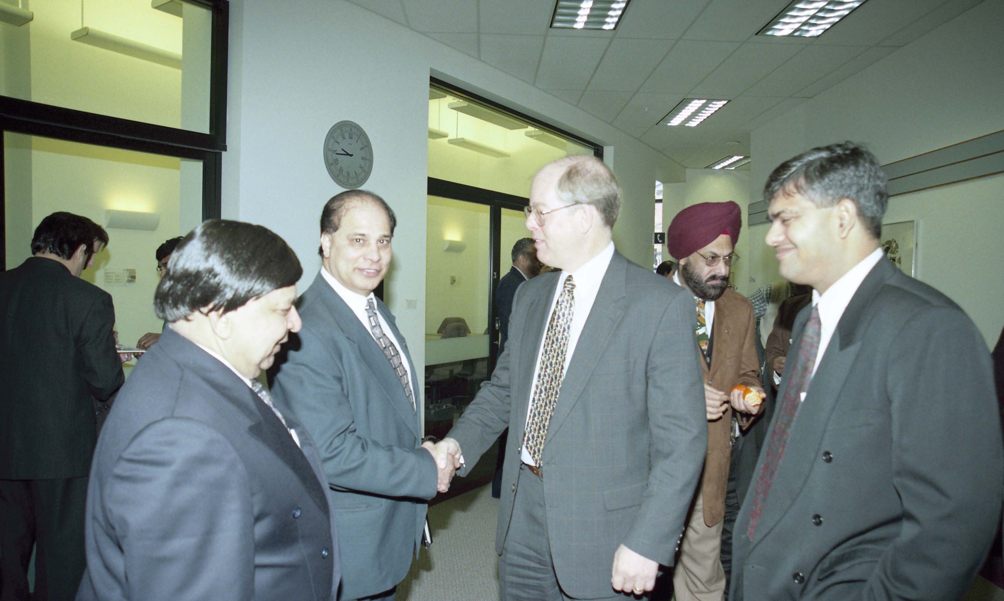 Photograph of a group of unidentified political figures greeting each other at a conference organized by the Immigration and Refugee Board of Canada [?] in Vancouver, British Columbia.