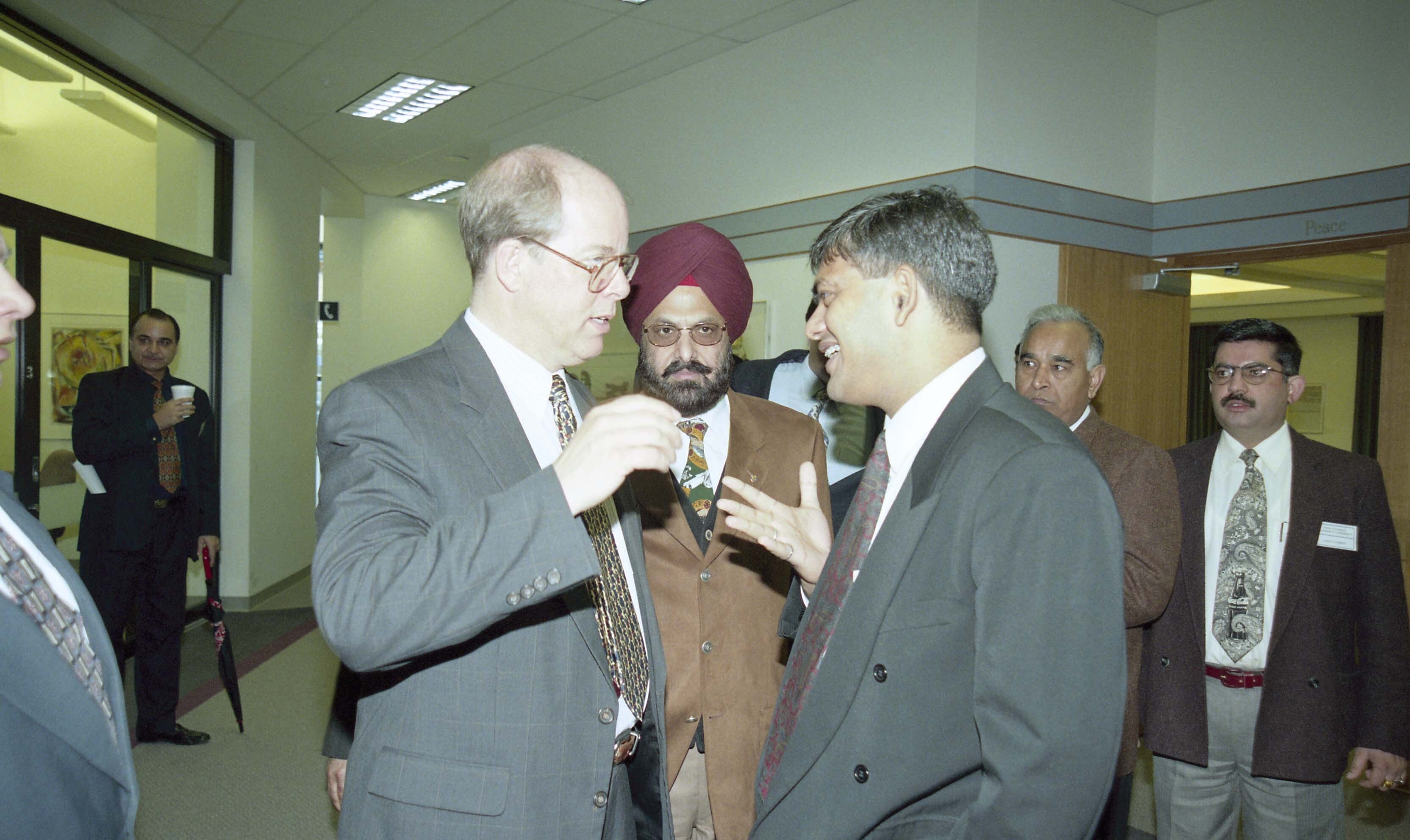 Photograph of a group of unidentified political figures greeting each other at a conference organized by the Immigration and Refugee Board of Canada [?] in Vancouver, British Columbia.