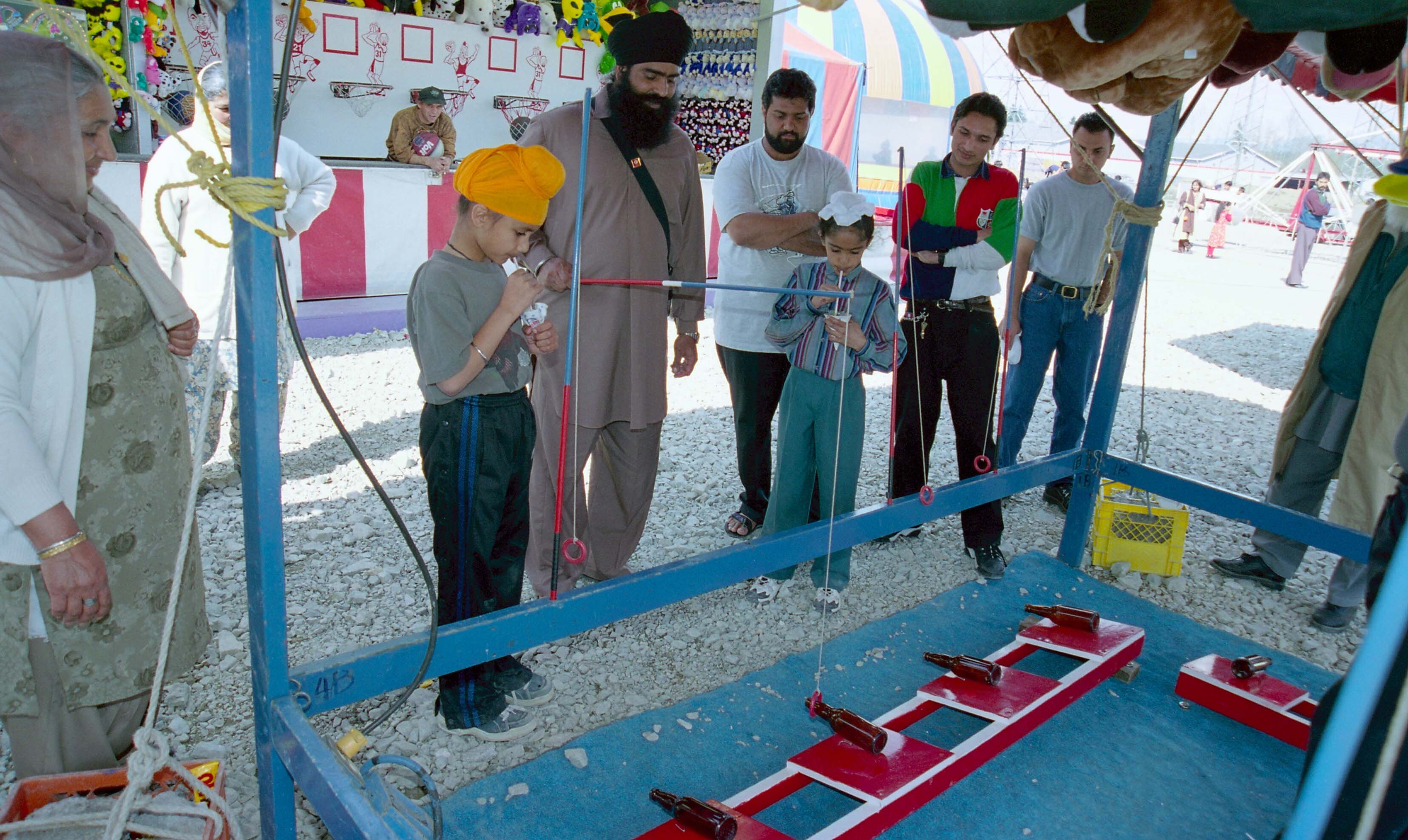 Photograph of attendees and children participating in games at a fair that took place in Surrey, British Columbia.