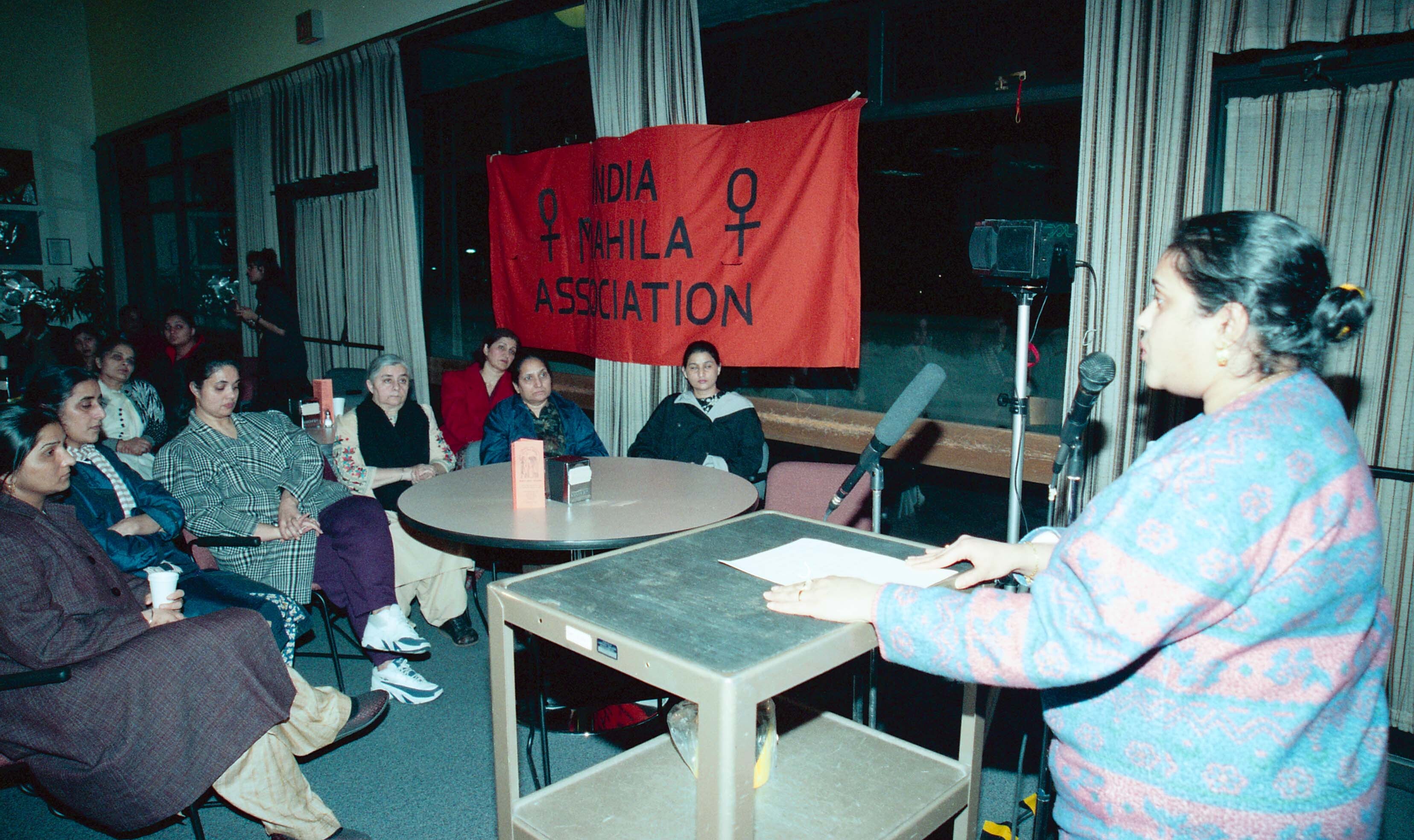 Photograph of an unidentified woman delivering a speech at a seminar organised by the India Mahila Association at Langara college in Vancouver, British Columbia.