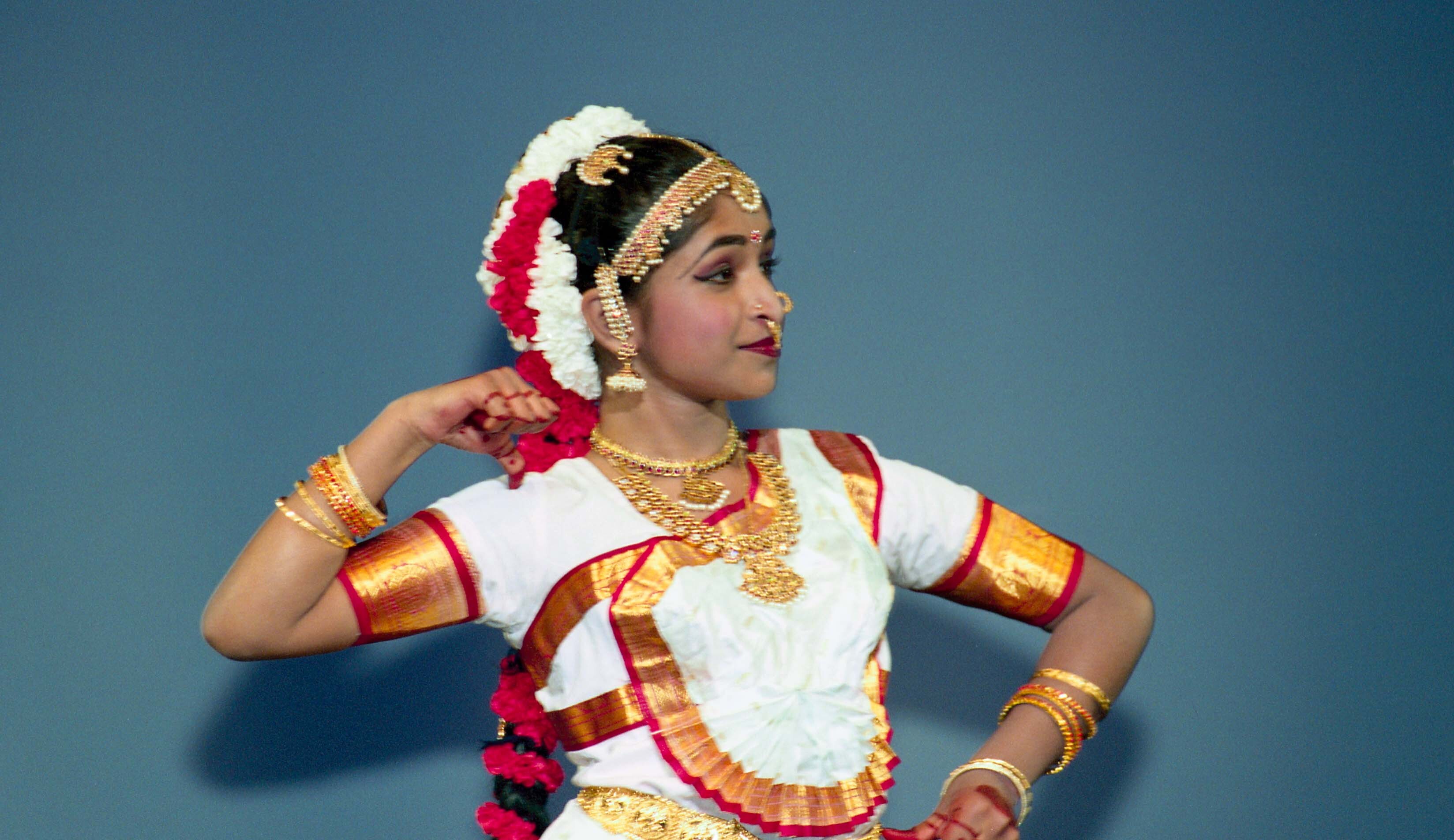 [Photograph of a Bharatanatyam performer striking a classical pose]