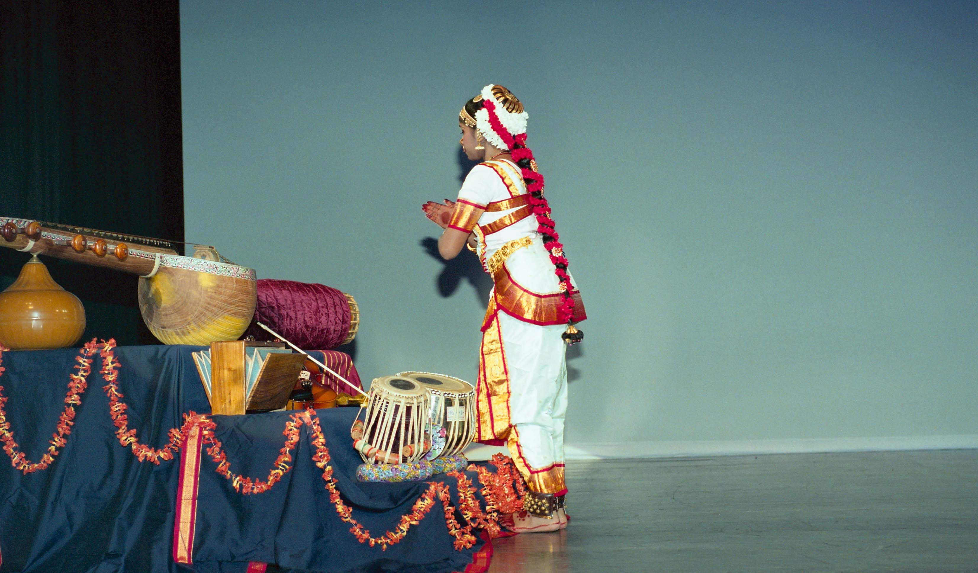 Photograph of an unidentified Bharatanatyam performer offering reverence to Indian classical musical instruments displayed on a theatrical stage.