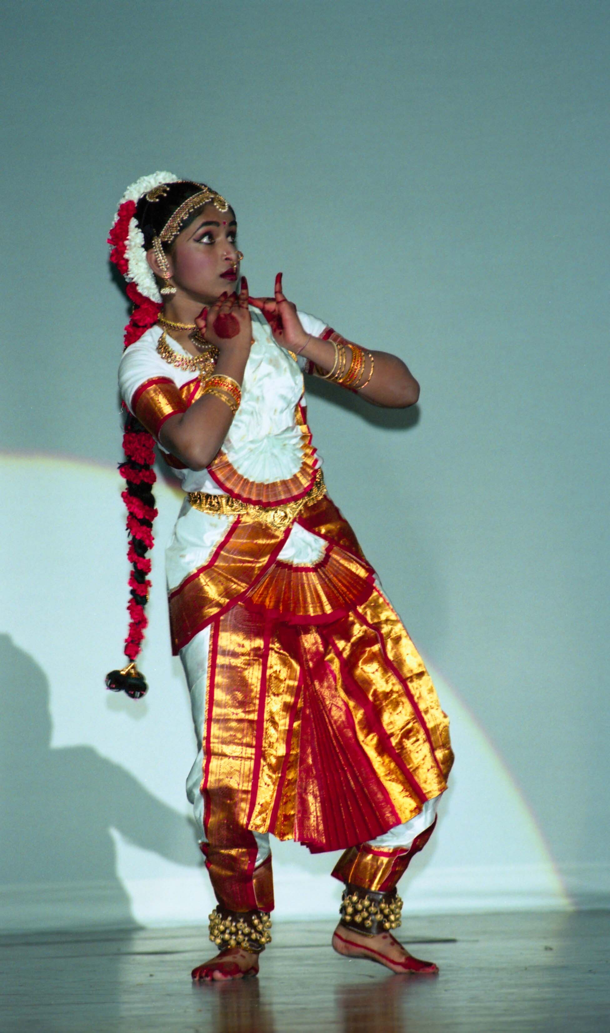 [Photograph of a Bharatanatyam performer striking a classical pose]