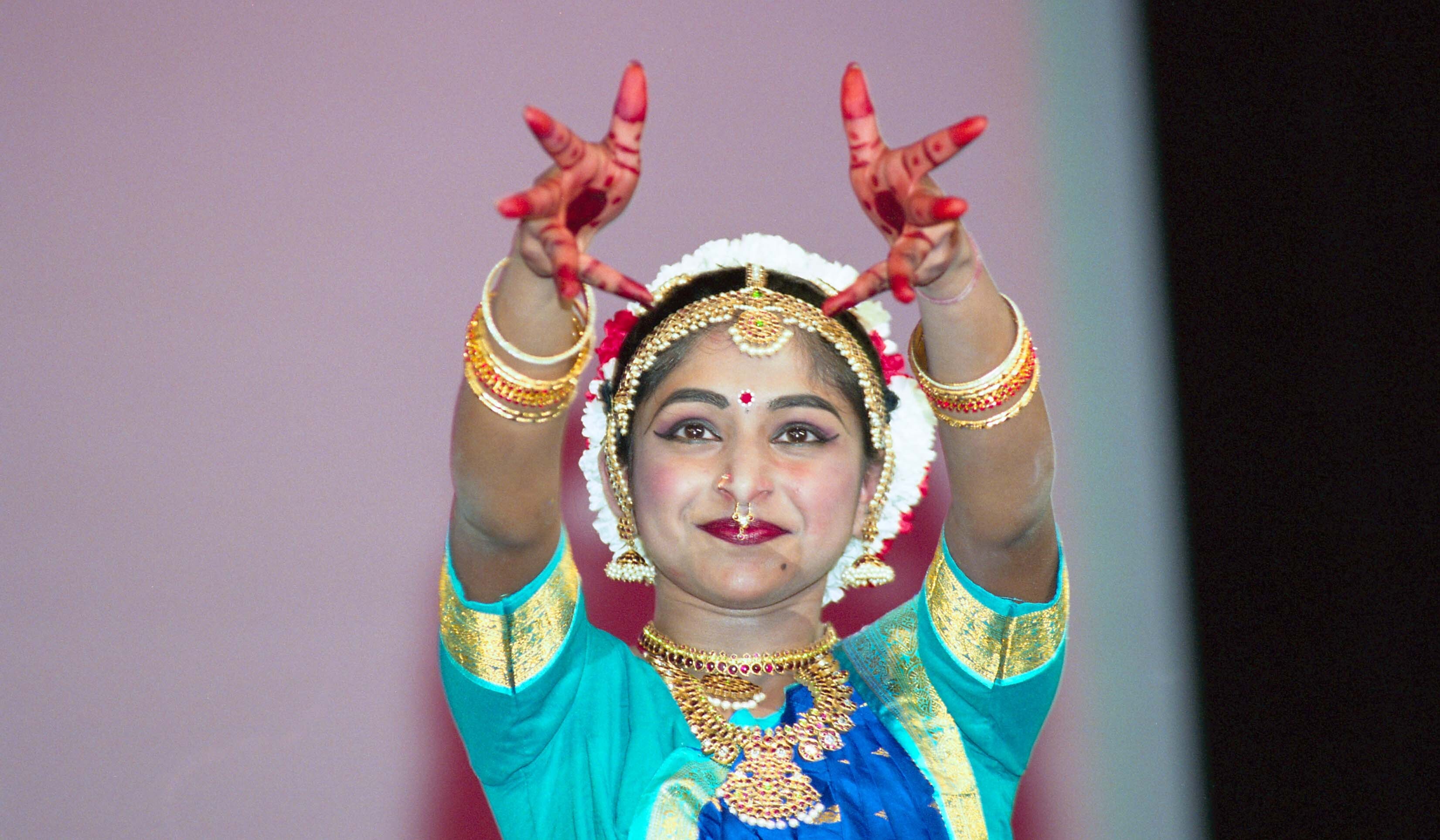 [Photograph of a Bharatanatyam performer striking a classical pose]